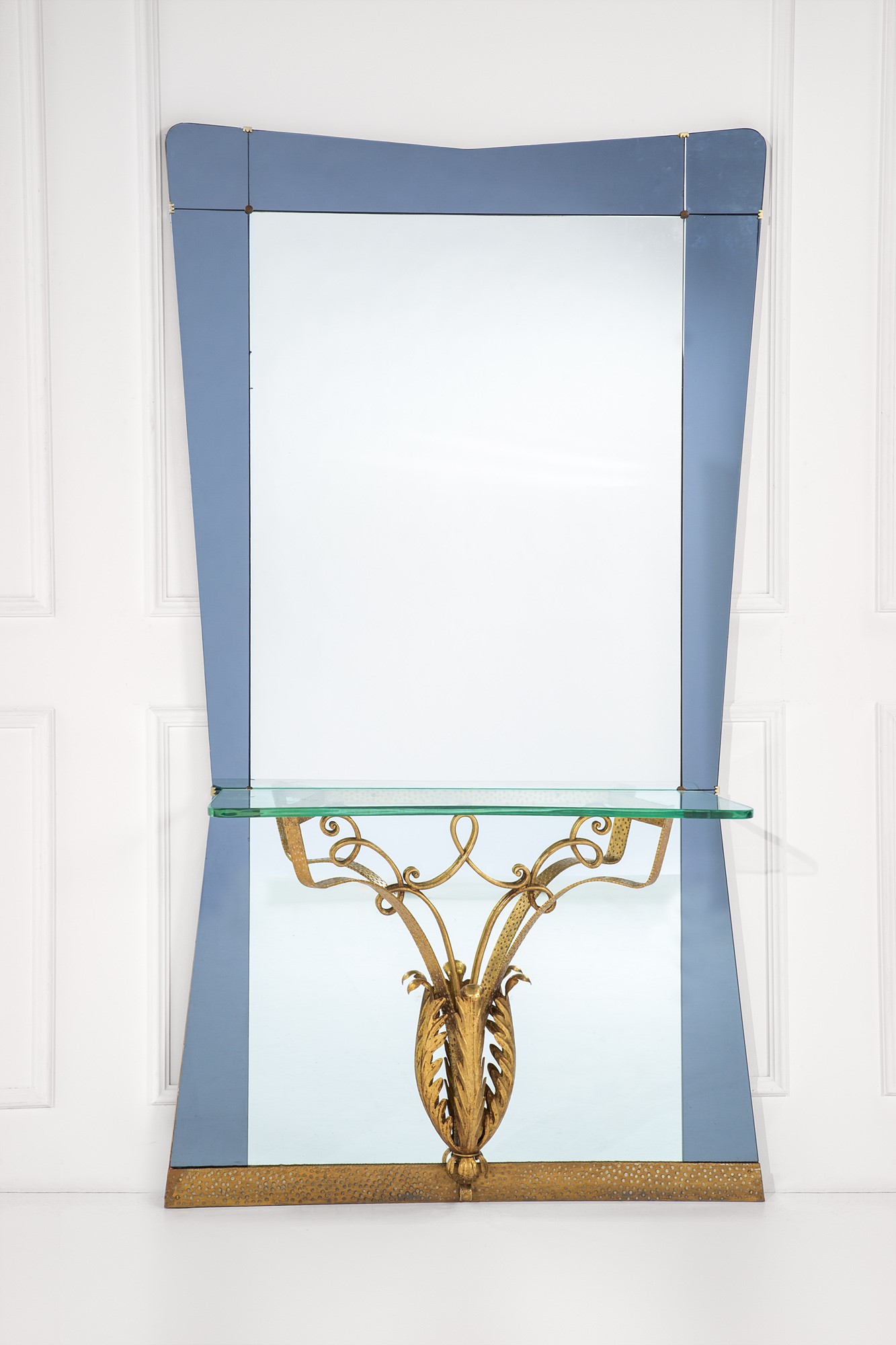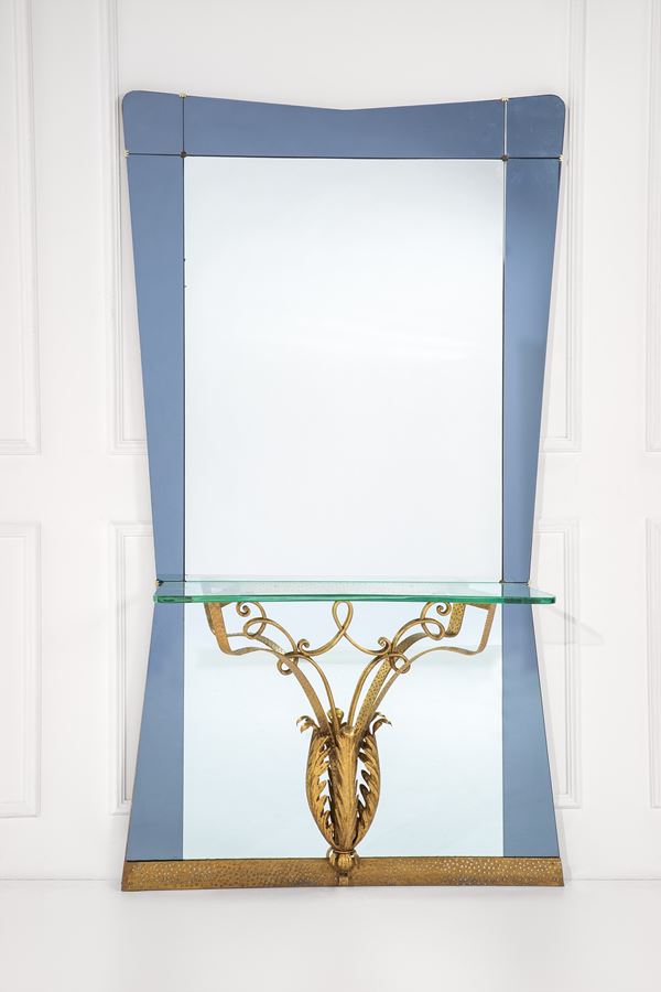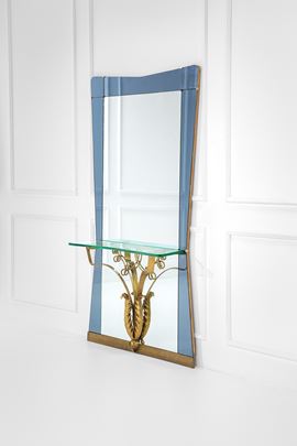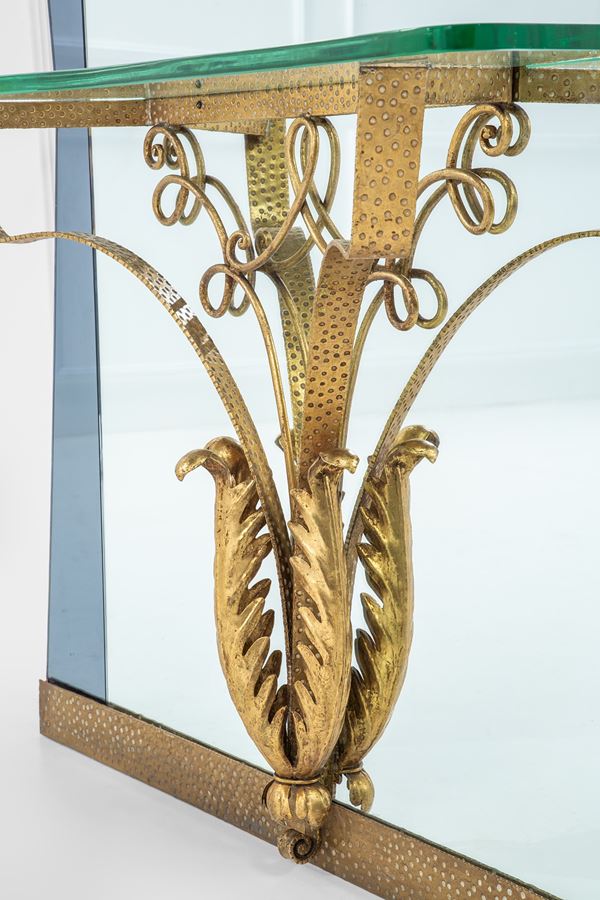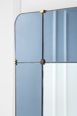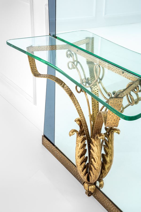 Vetro colorato, vetro specchiato, cristallo molato, metallo dorato sagomato e scolpito, ottone.