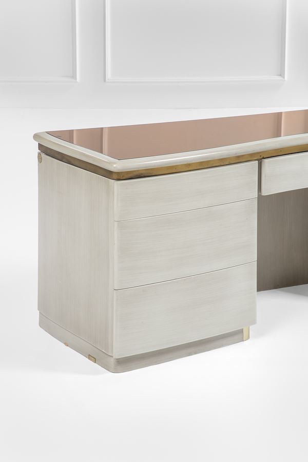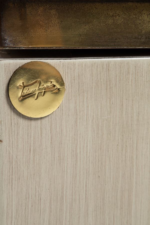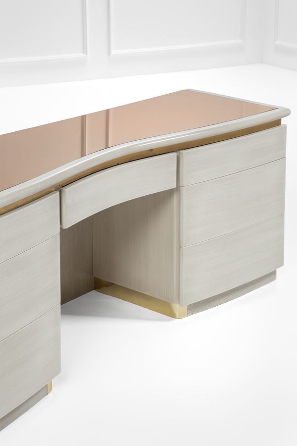 Legno laccato patinato, ottone, vetro specchiato ambrato.