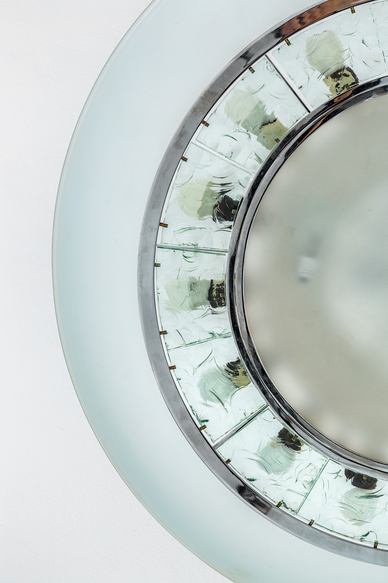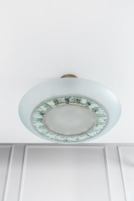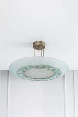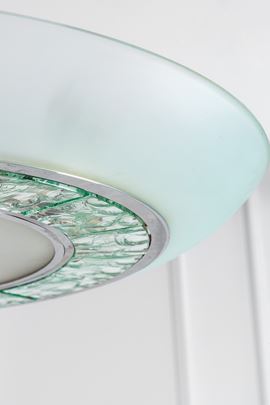 Cristallo curvato satinato, cristallo scalpellato, ottone nichelato.