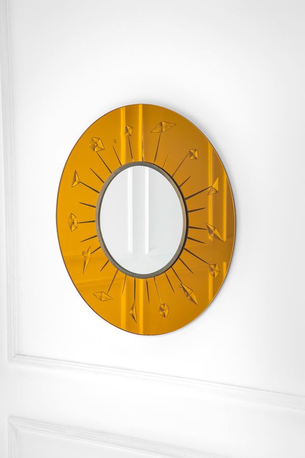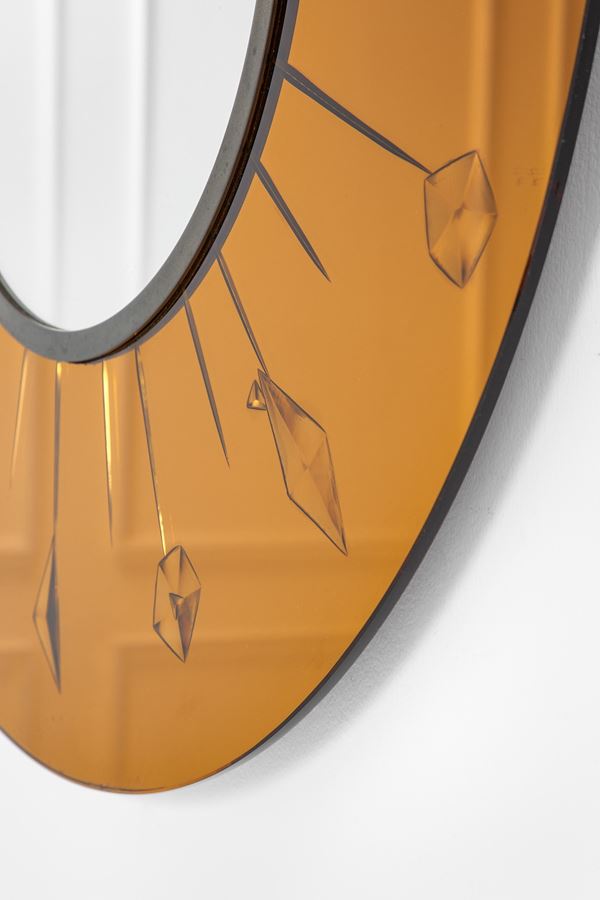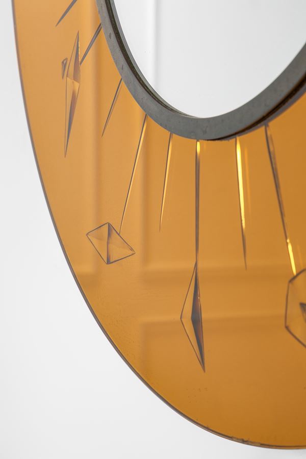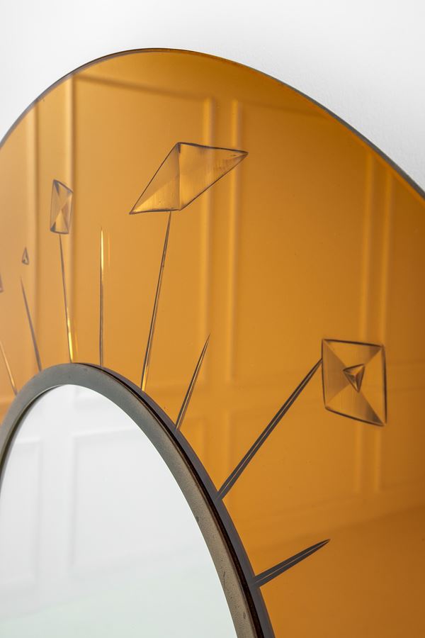 Vetro inciso colorato, cristallo specchiato, ottone.