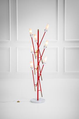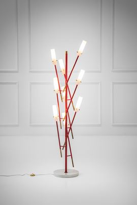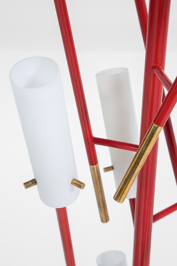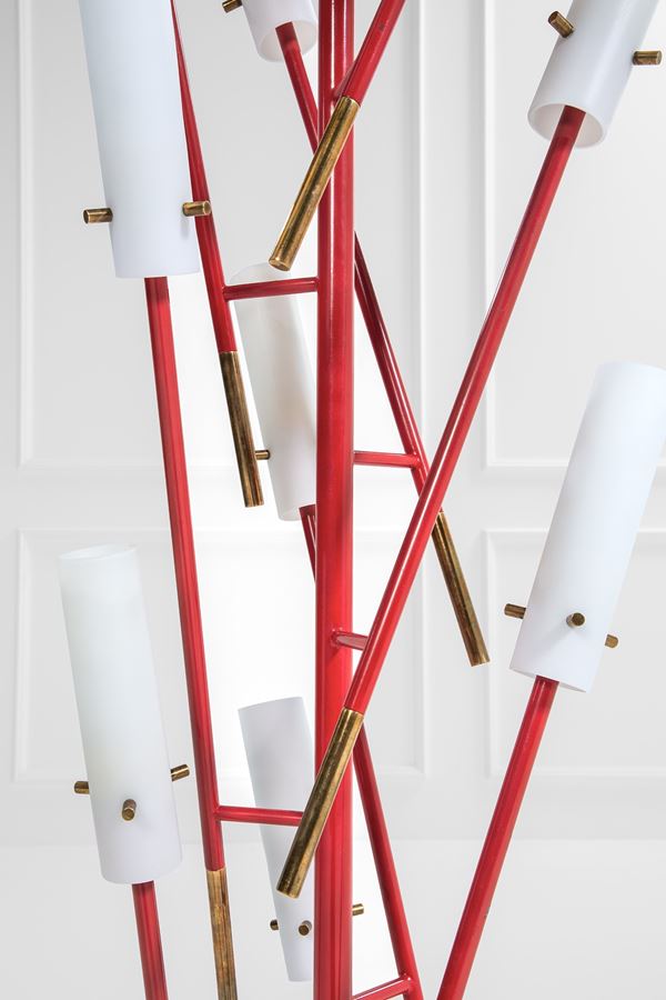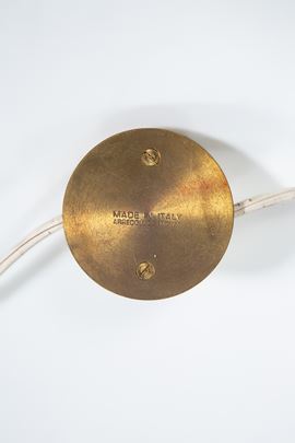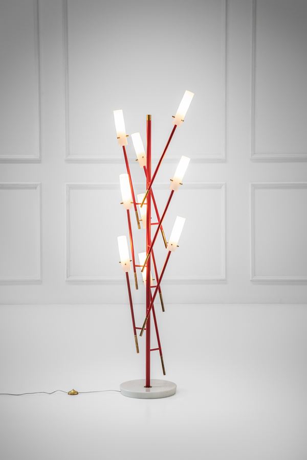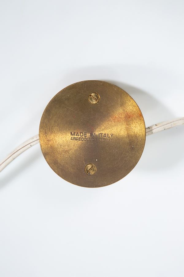 Metallo verniciato, ottone, vetro bianco satinato, marmo.