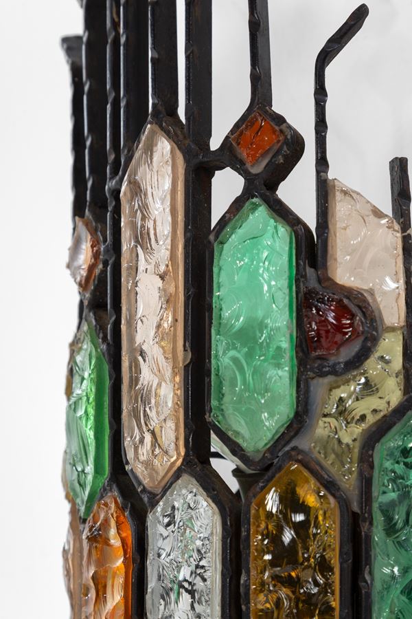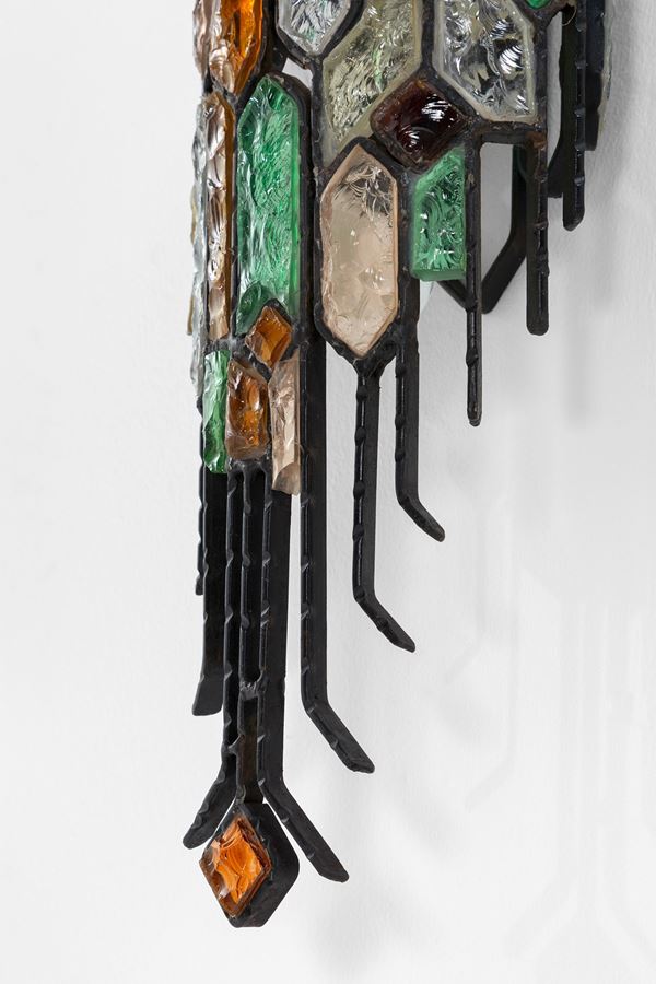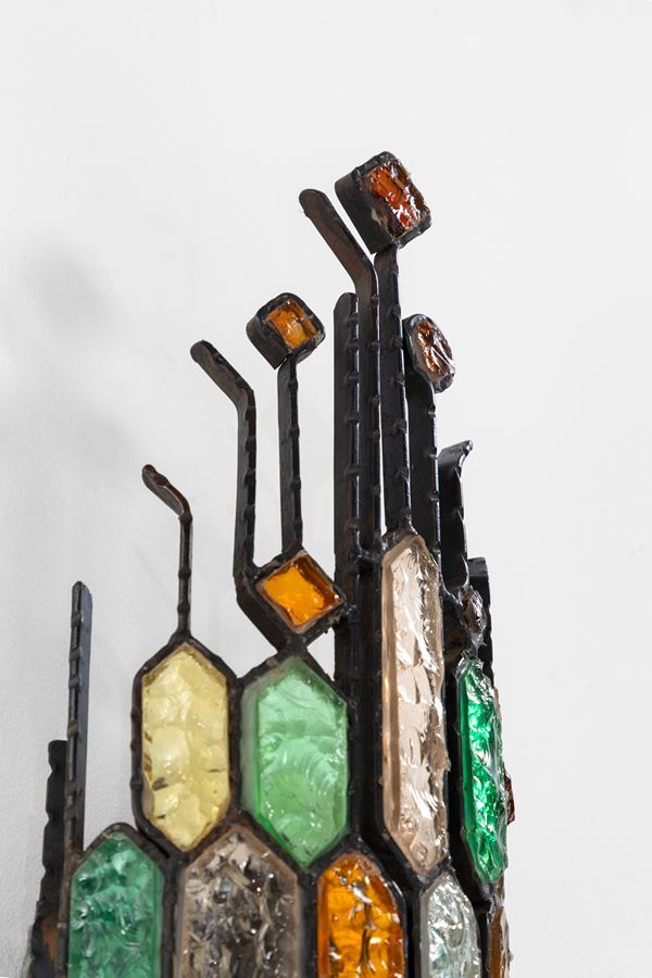 Metallo brunito, elementi in vetro colorato lavorati a spacco.
