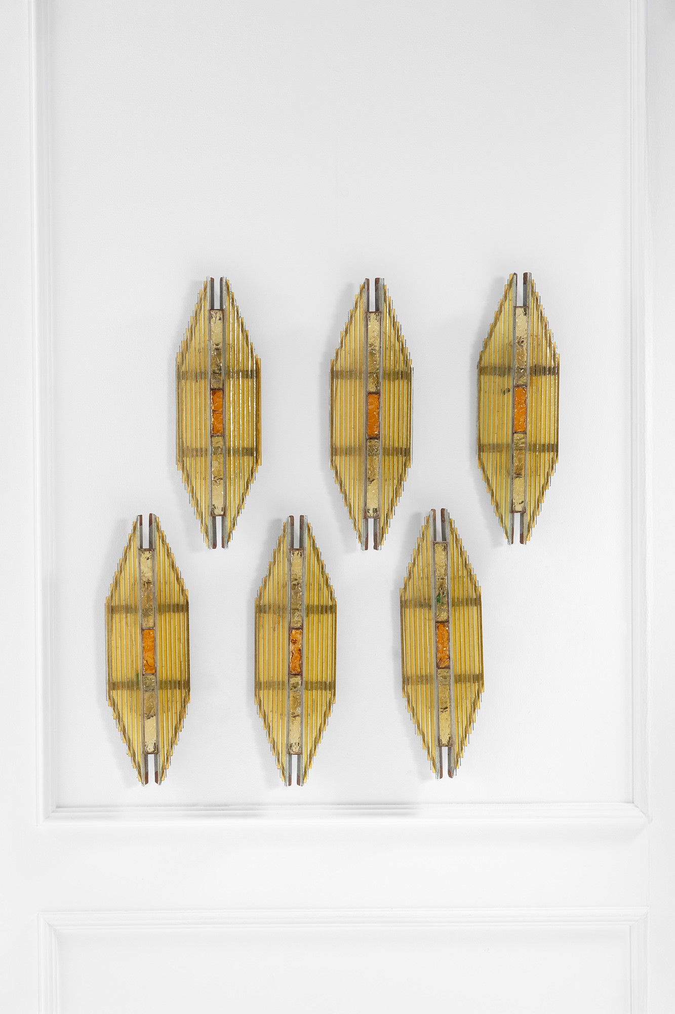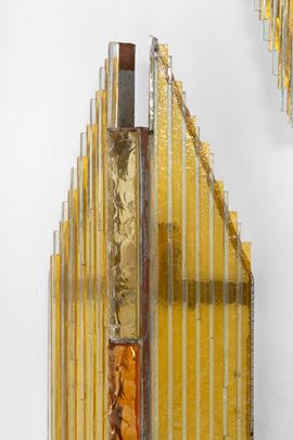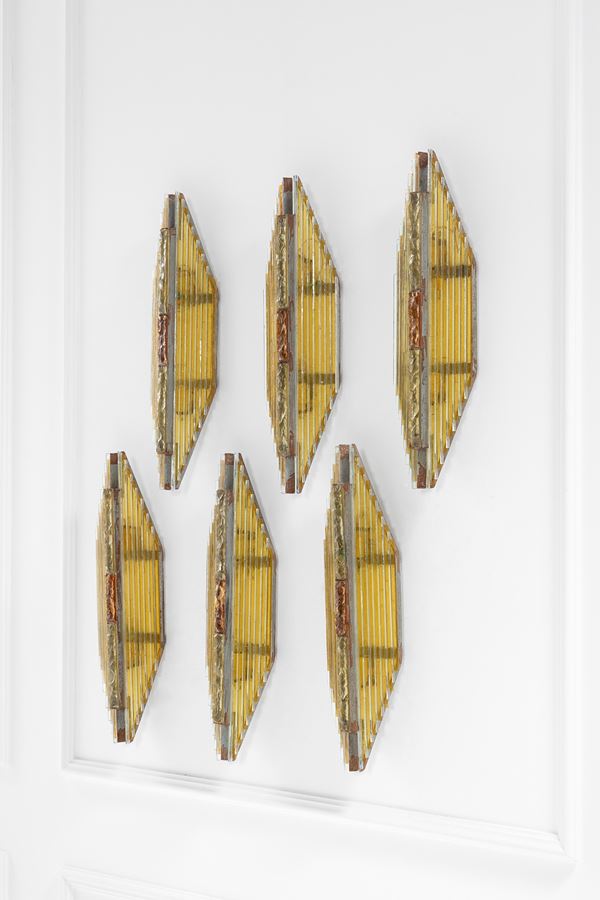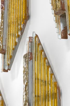 Metallo, elementi in vetro colorato lavorato a spacco, bacchette di vetro colorato.