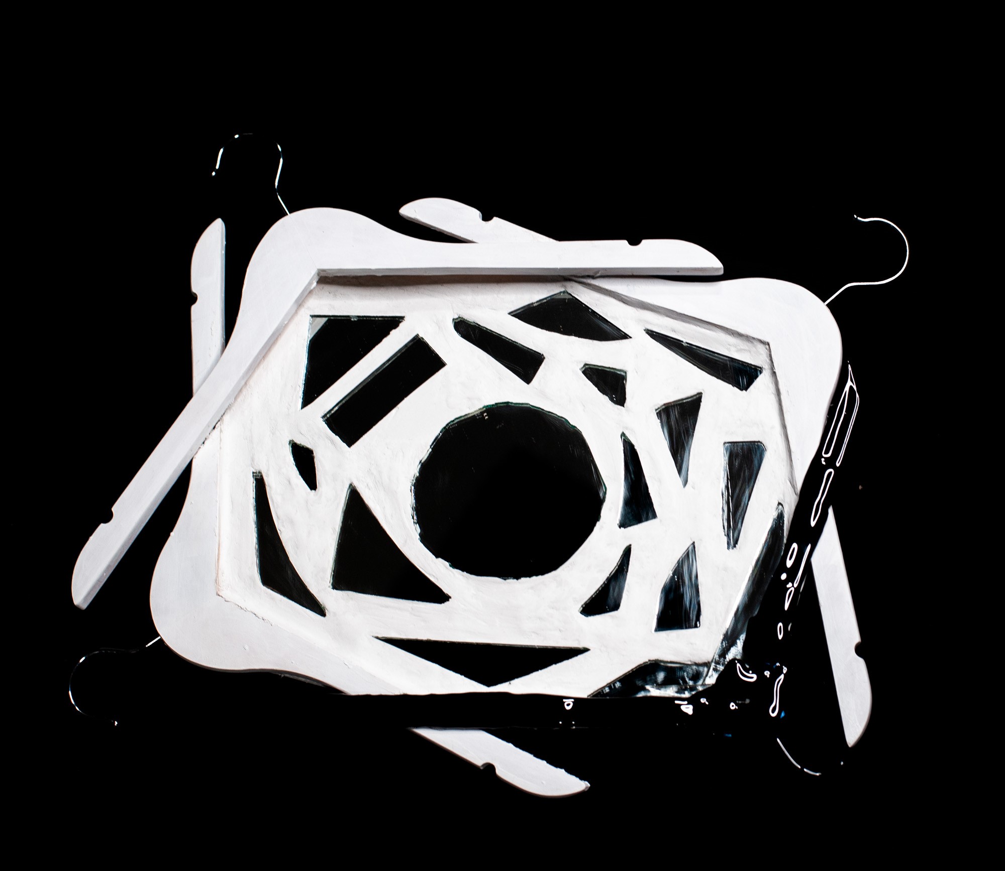 Legno, gesso, grucce, specchio, vetro, vetrofusione, colatura in gesso, silicone, acrilico.