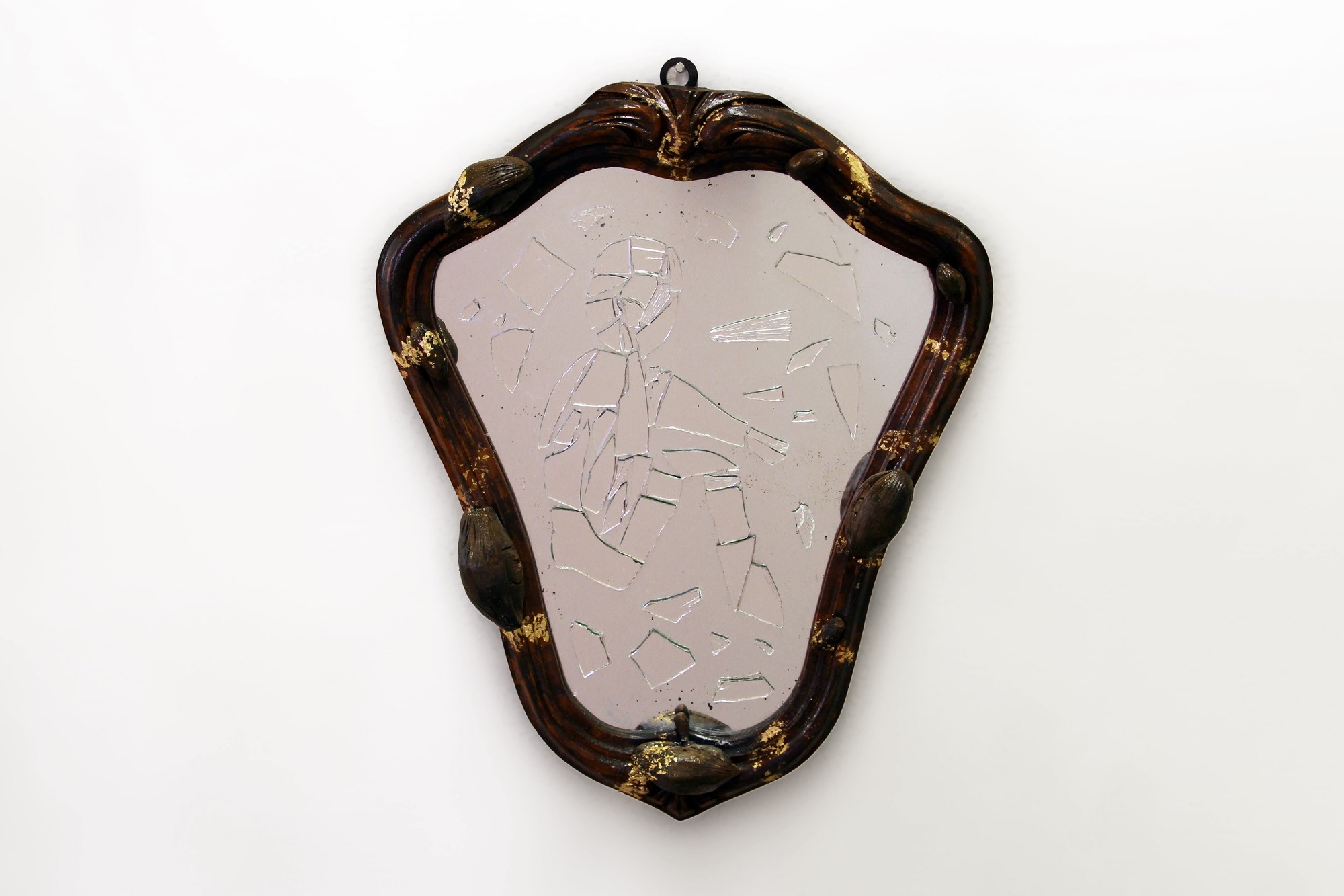 Specchio antico con frammenti applicati, sulla cornice occhi di terracotta, foglia d'oro, colore acrilico e patinatura finale a gomma lacca.