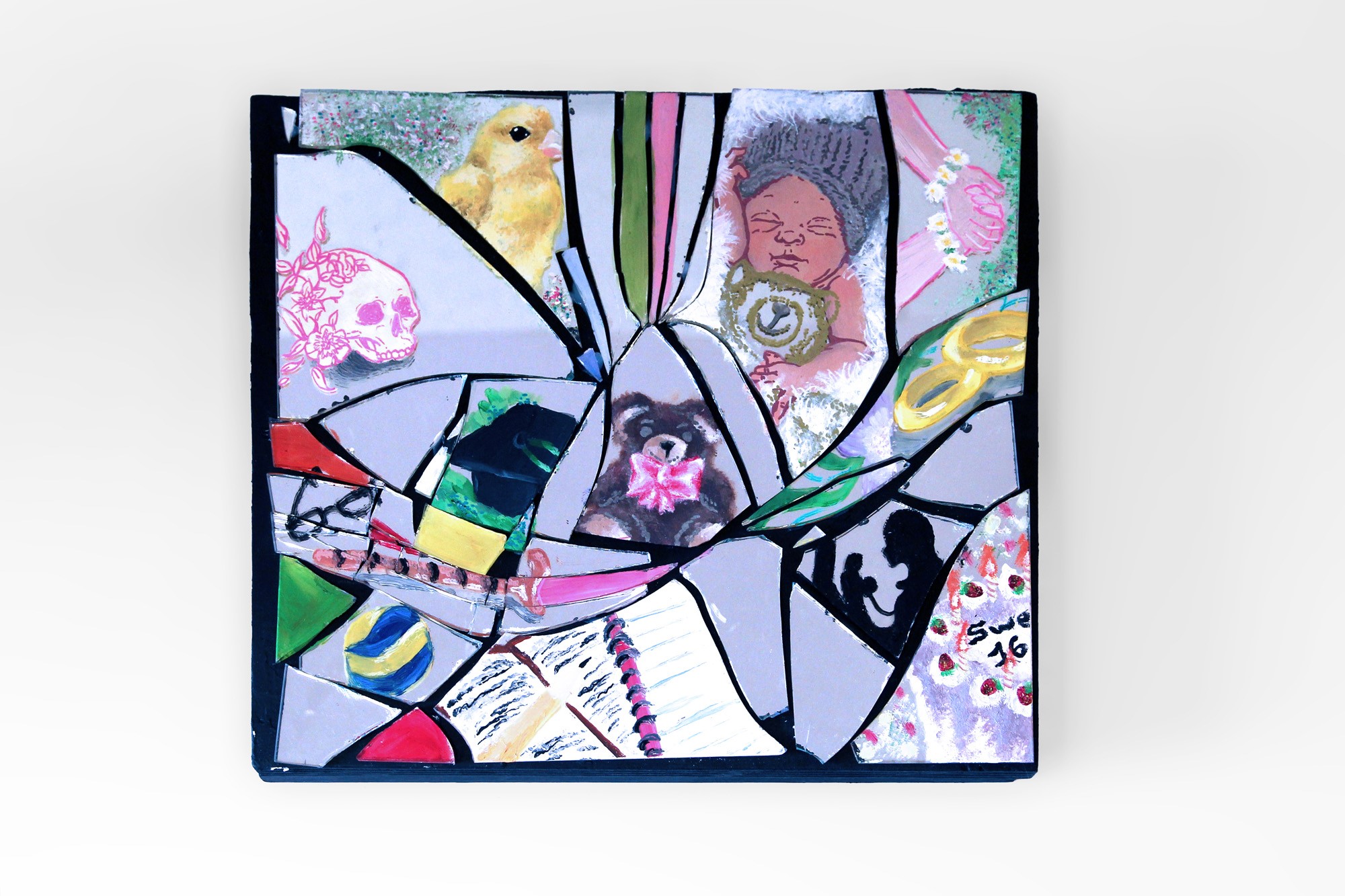 Pezzi di specchio dipinti con tecnica mista, assemblati su tavola in legno.