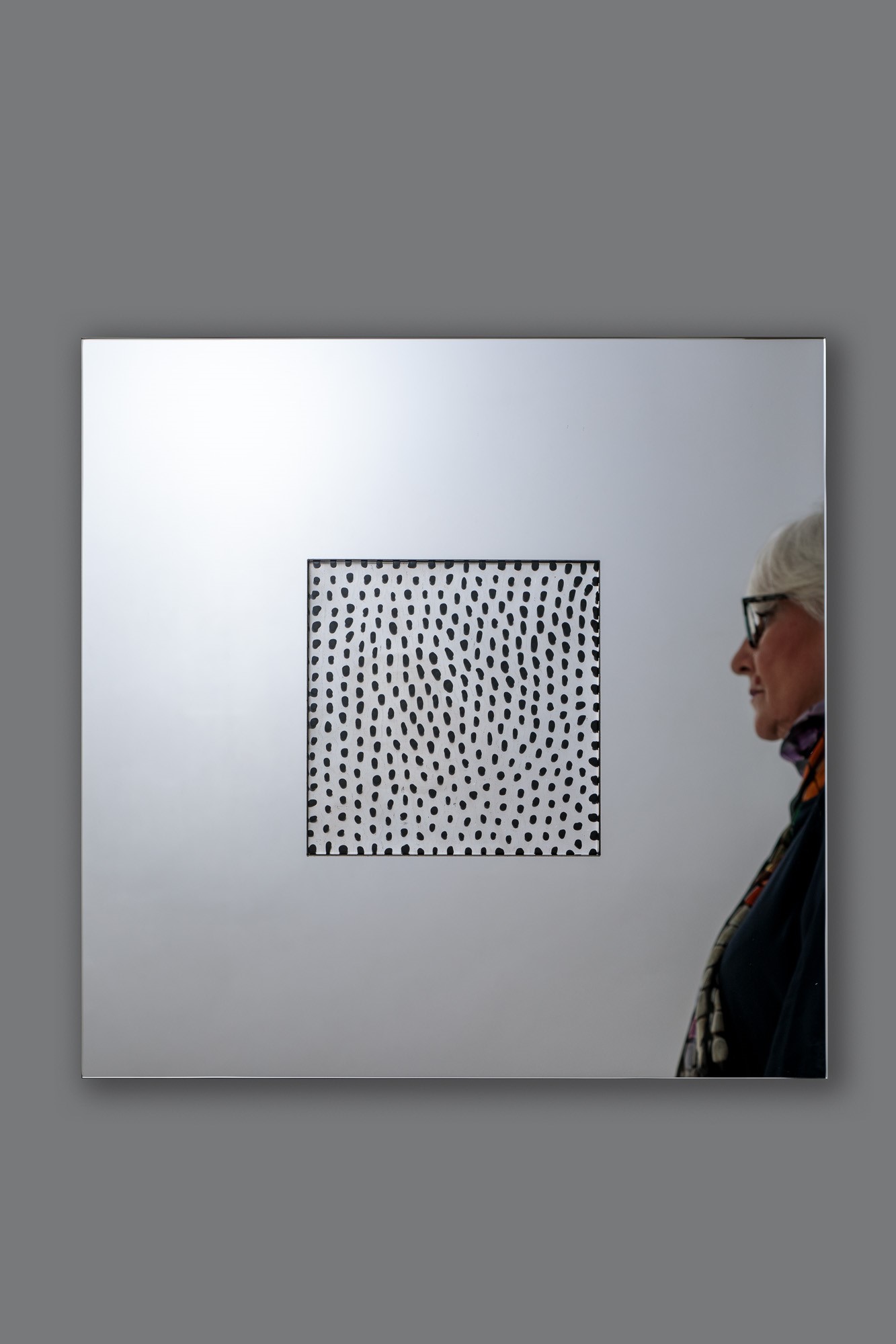 Specchio con intarsio di una piastra in vetro realizzata con la tecnica della vetrofusione.