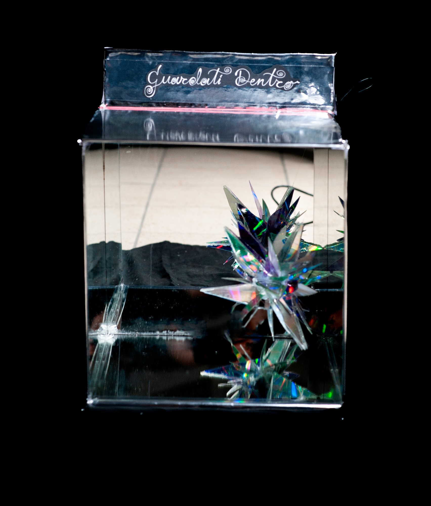 Specchio, carta adesiva, compensato, cd, filo da pesca.