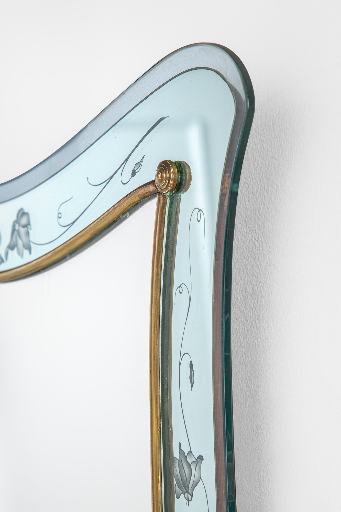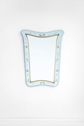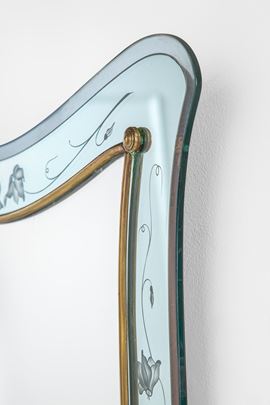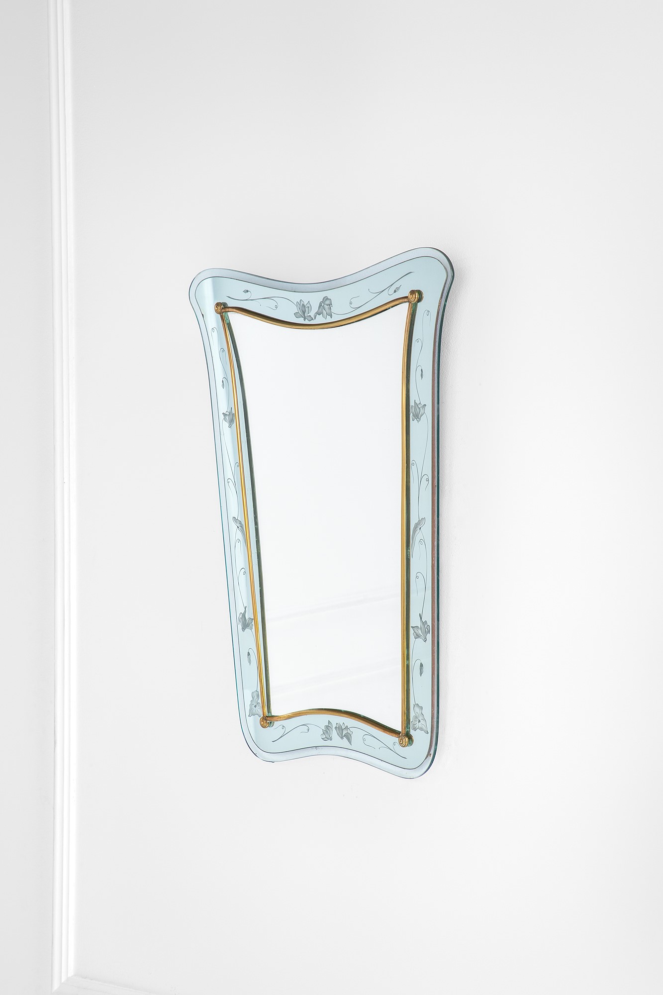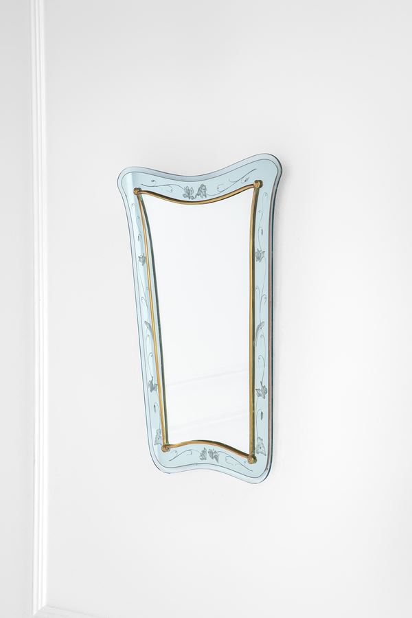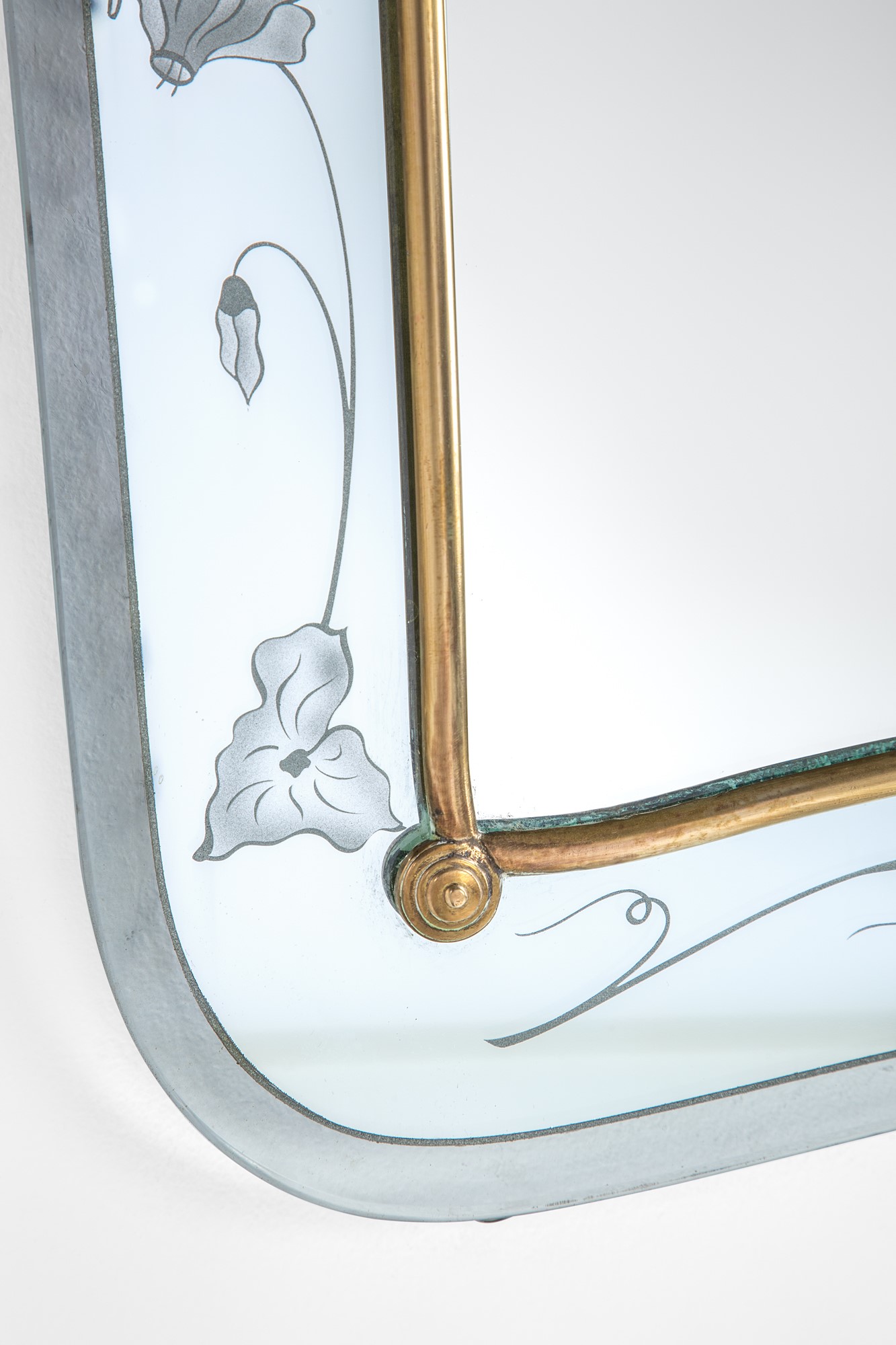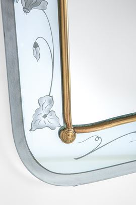 Ottone lucido, vetro specchato con decori incisi a fiori.