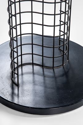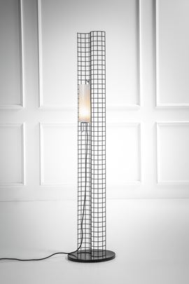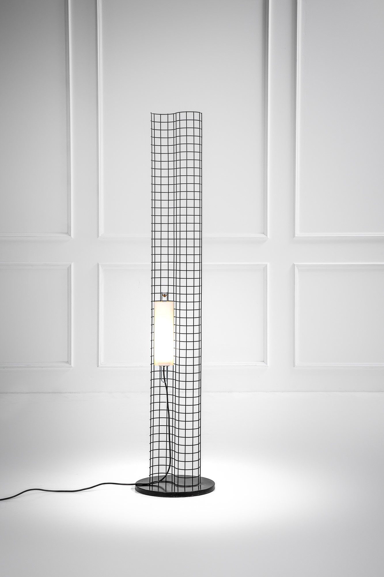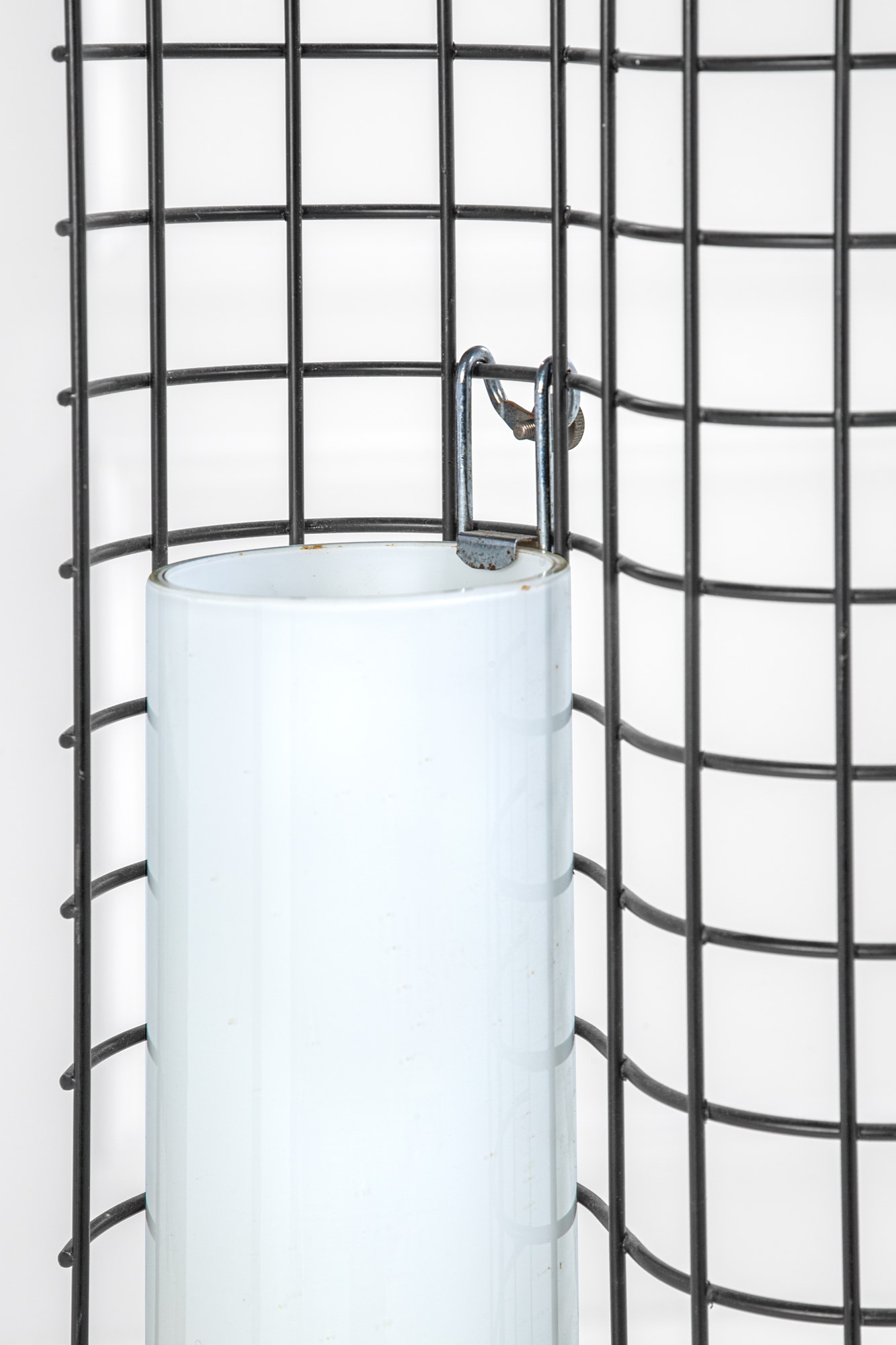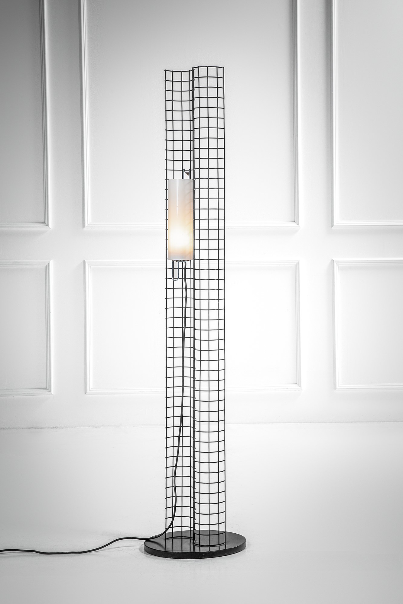 Metallo cromato, metallo verniciato, rete metallica verniciata, vetro opalino.