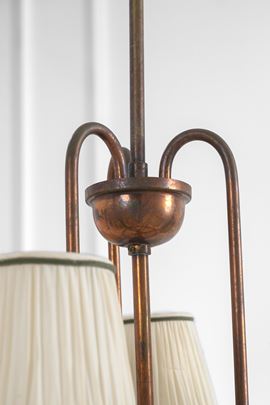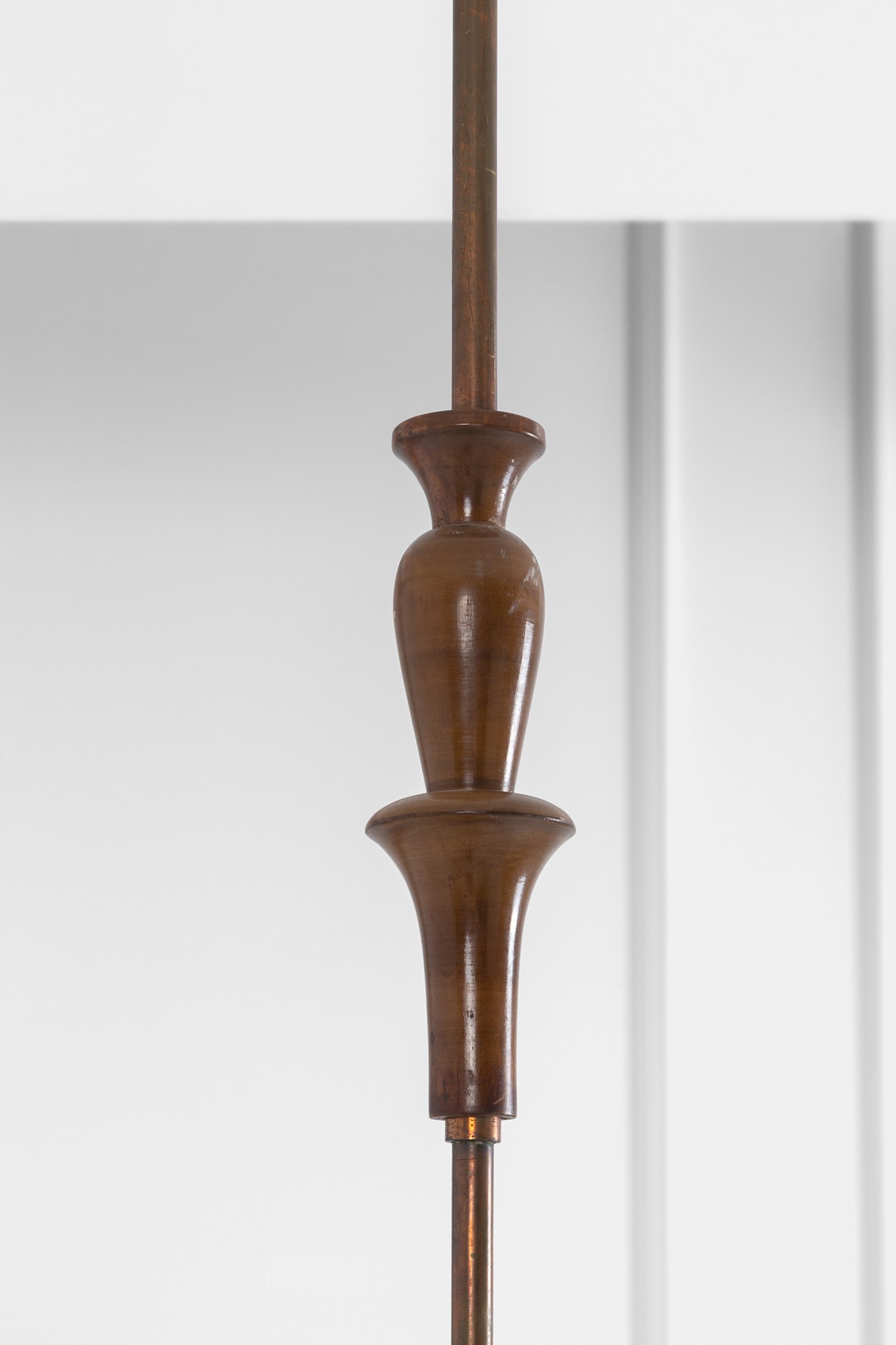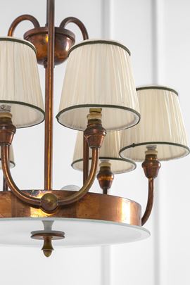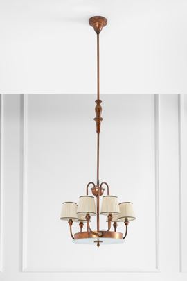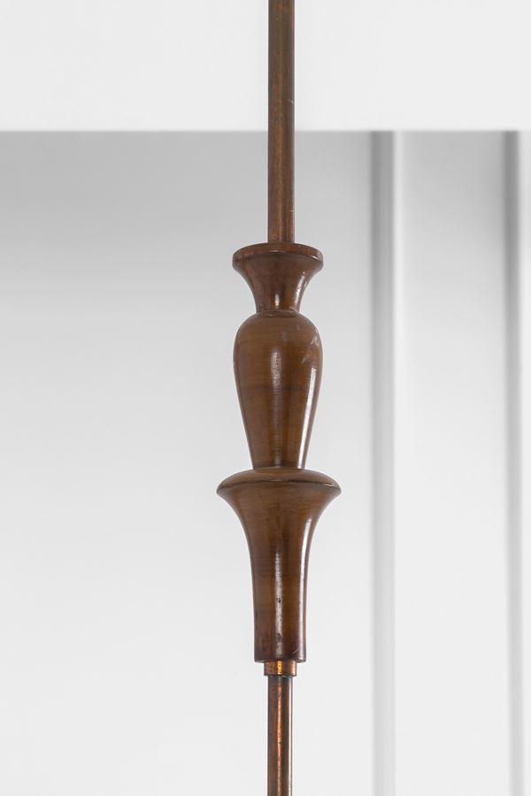 Rame, legno massello tornito, cristallo satinato, tessuto.