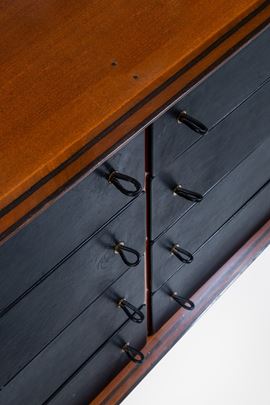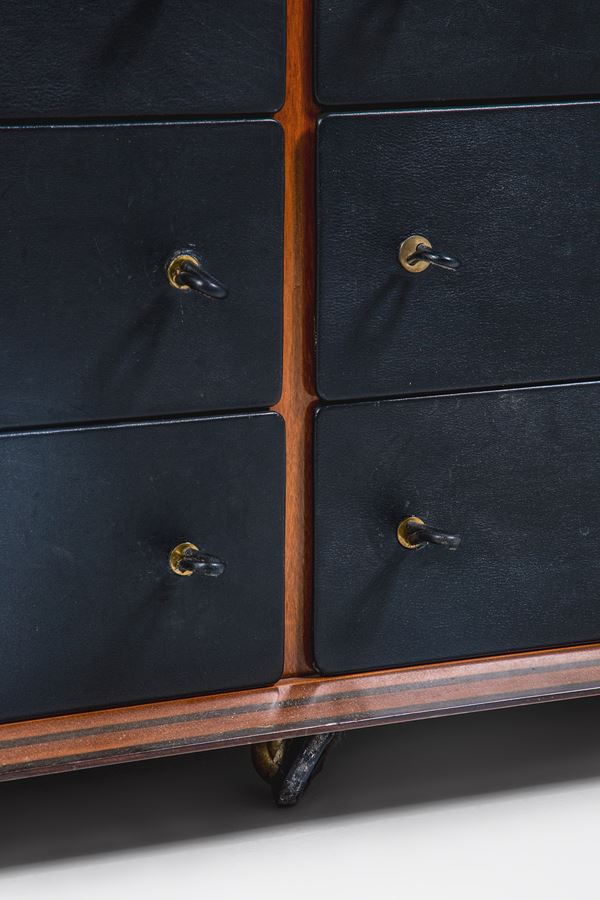 Legno di noce massello con inserti in legno ebanizzato, pelle.