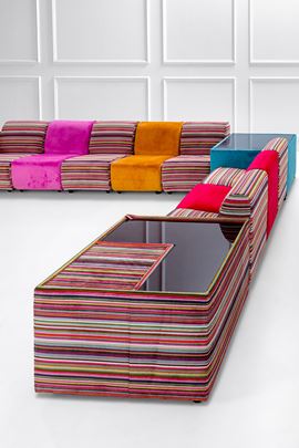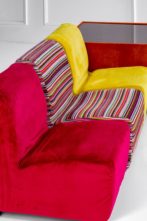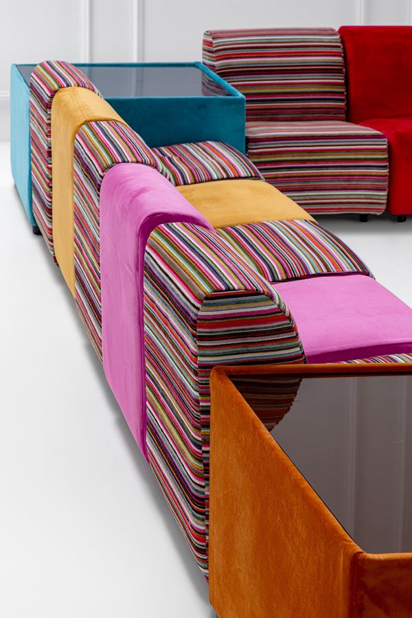 Elementi modulari rivestiti in tessuto, vetro colorato.