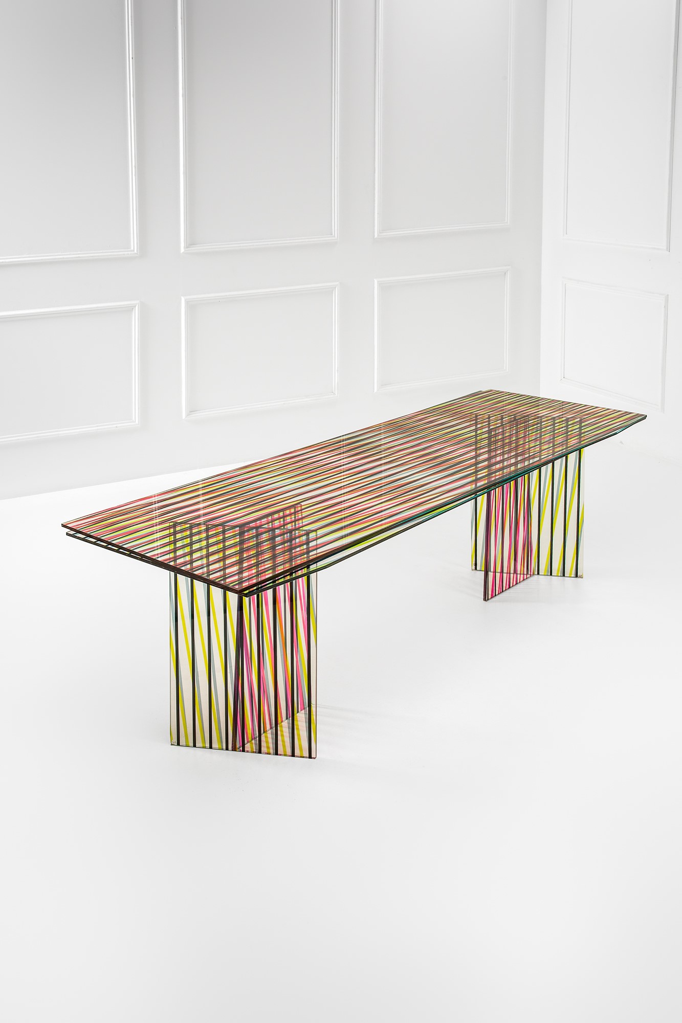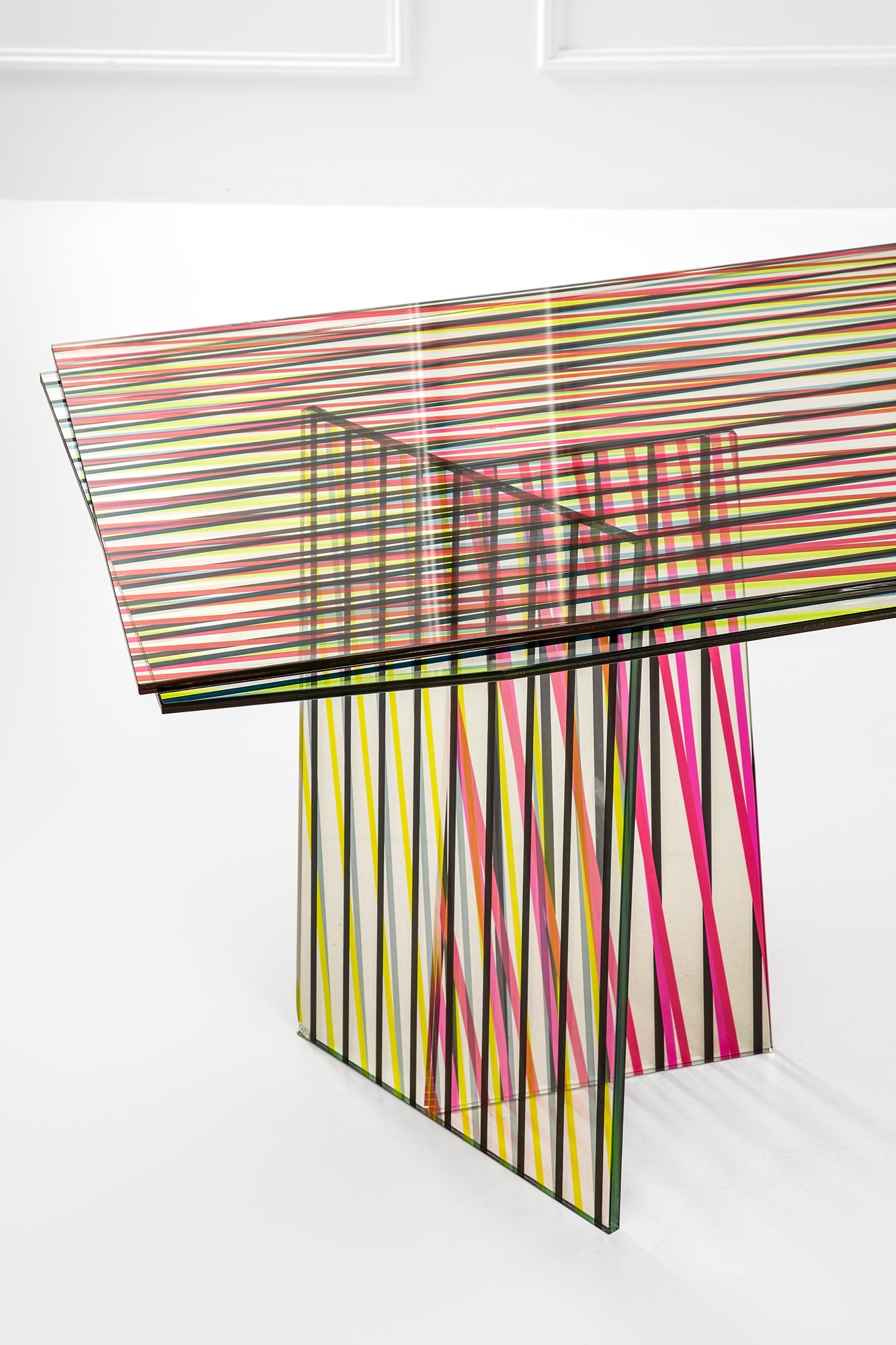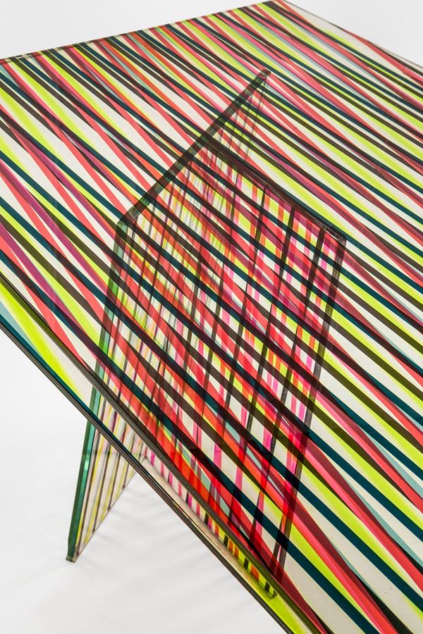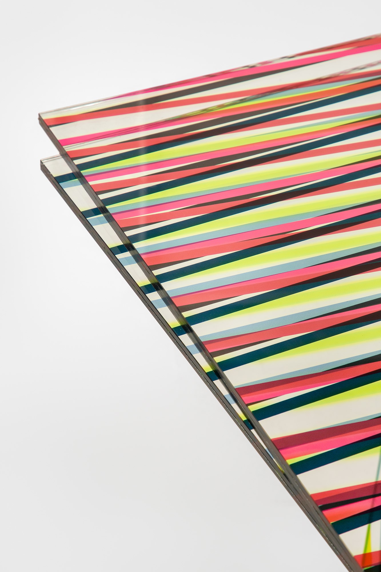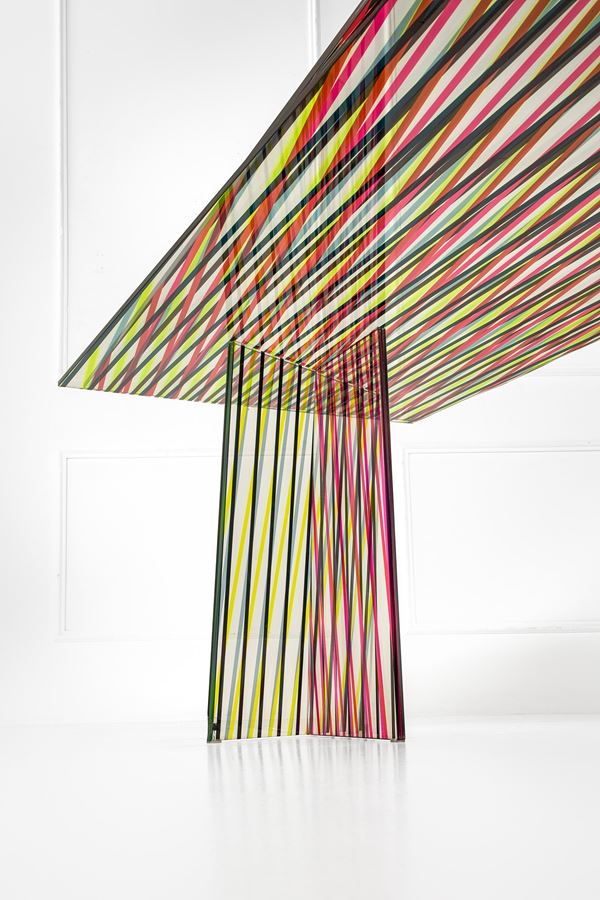 Cristallo trasparente extrachiaro stratificato con decoro policromatico tridimensionale. Cristalli assemblati con sovrapposizione sfalsata in modo da accentuare la dinamica dell’effetto grafico.