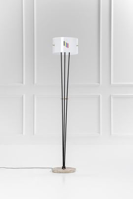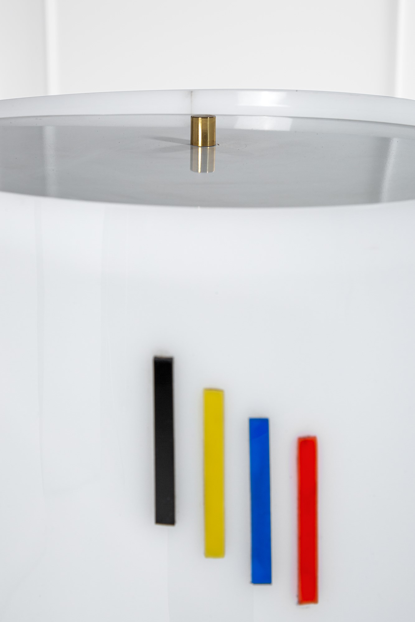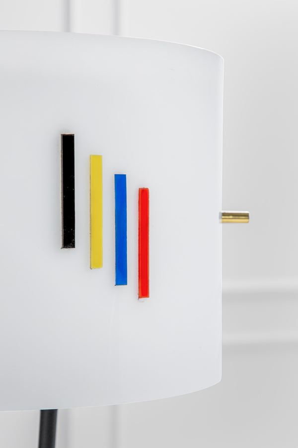 Ottone, metallo verniciato, metacrilato curvato e decorato.