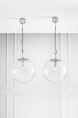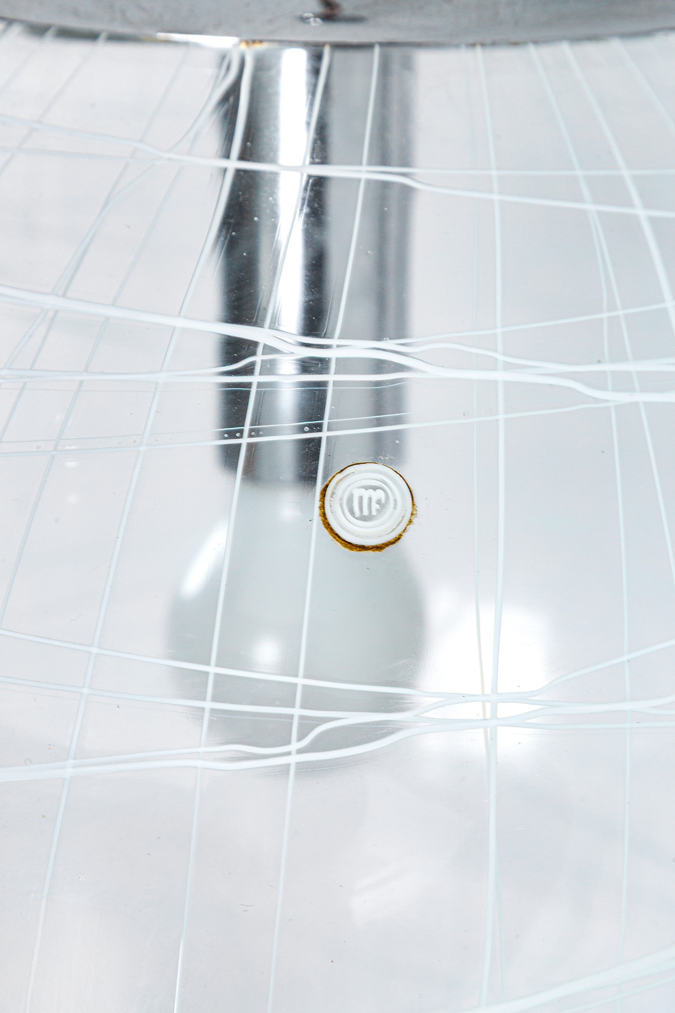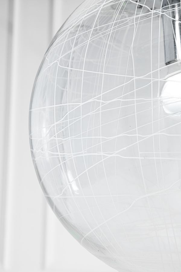 Vetro trasparente con applicazioni di fili di vetro bianco.