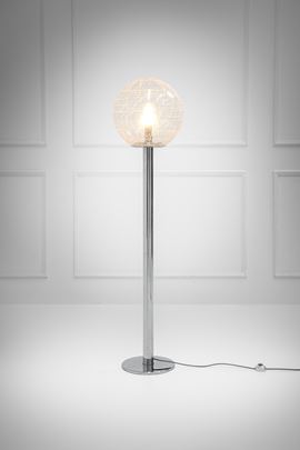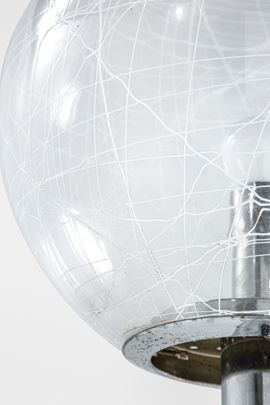 Metallo cromato, vetro trasparente con applicazione di fili di vetro bianco.