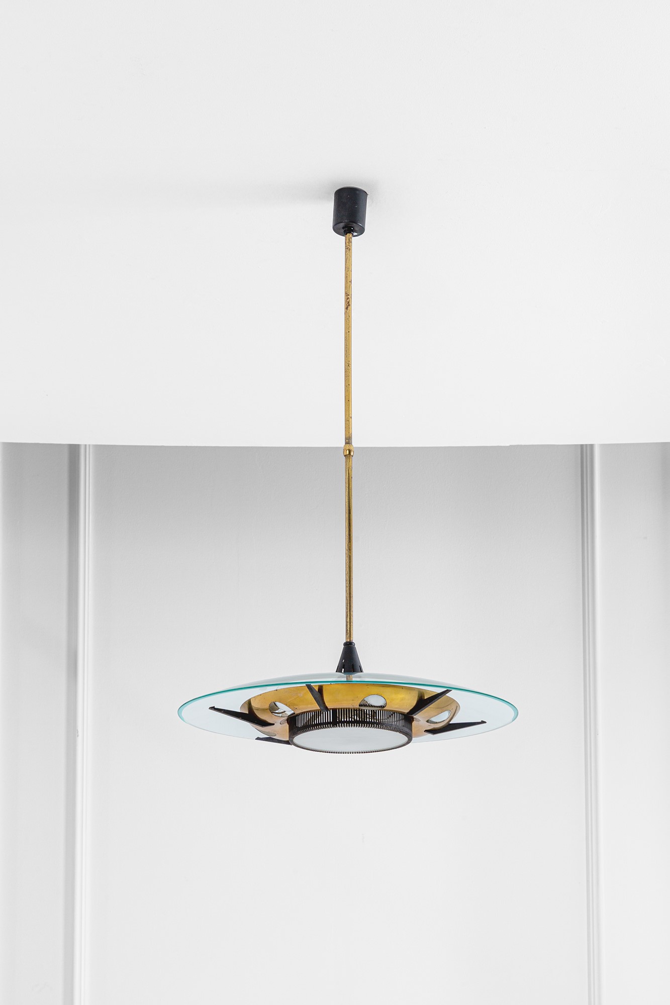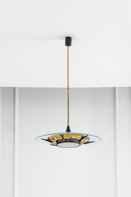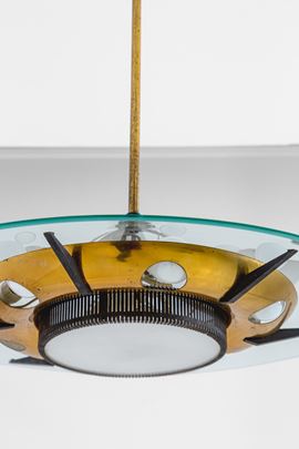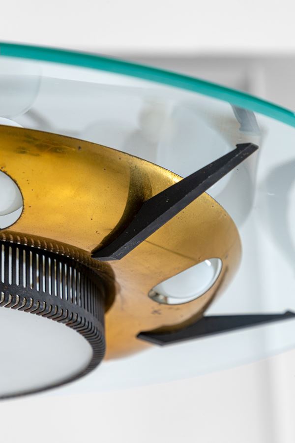 Ottone, metalloe verniciato, vetro curvato molato.