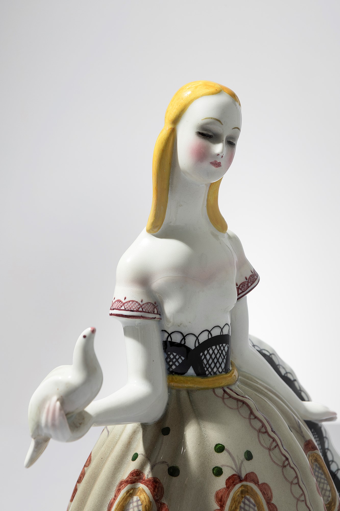 Terraglia modellata a colaggio, decorata in policromia sotto vernice.