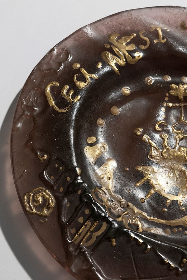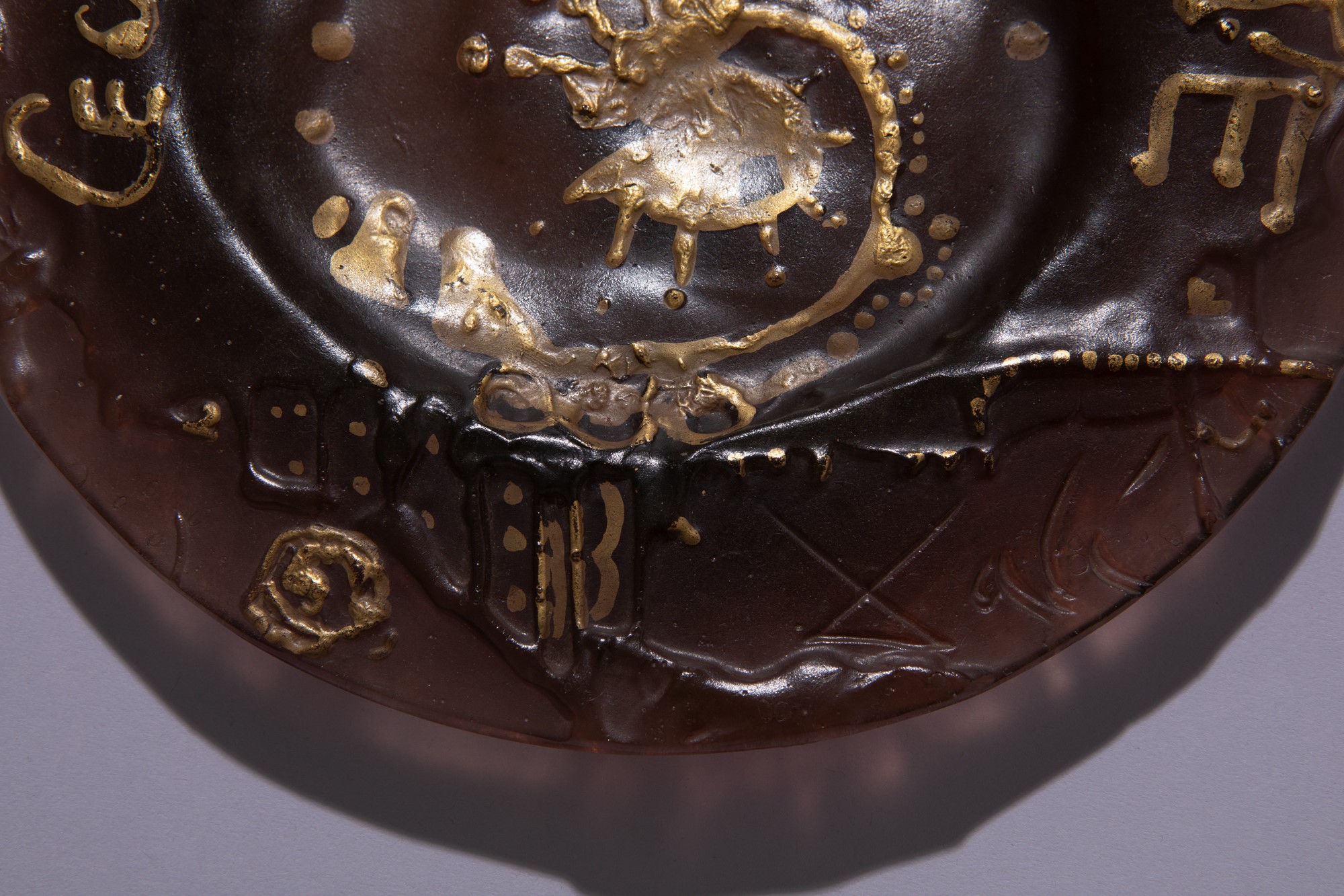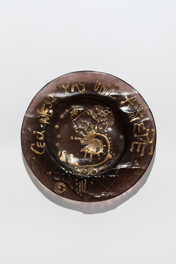 Piatto in pasta di vetro bordeaux con decori in oro.