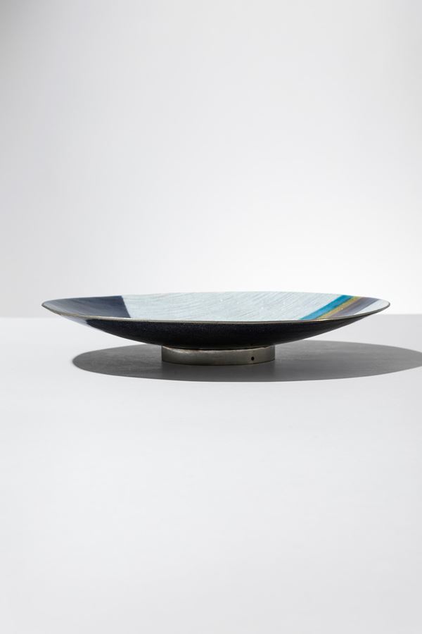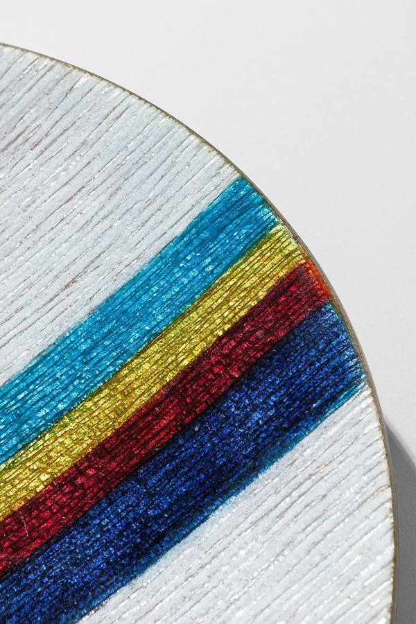 Smalto dipinto policromo su rame e lamina d’argento incisa.