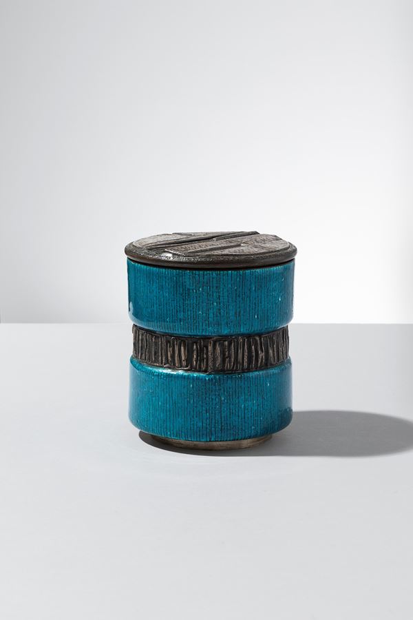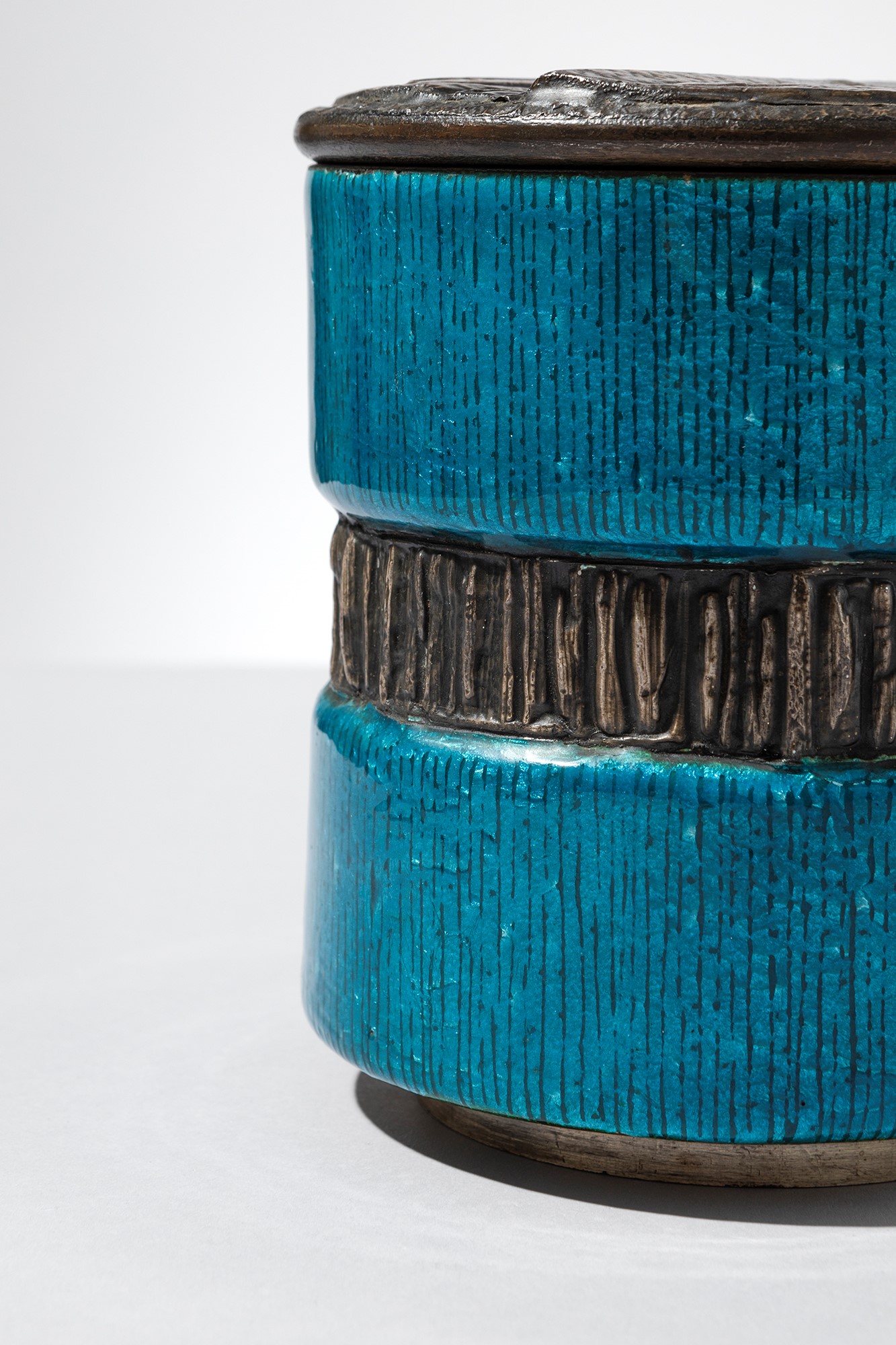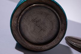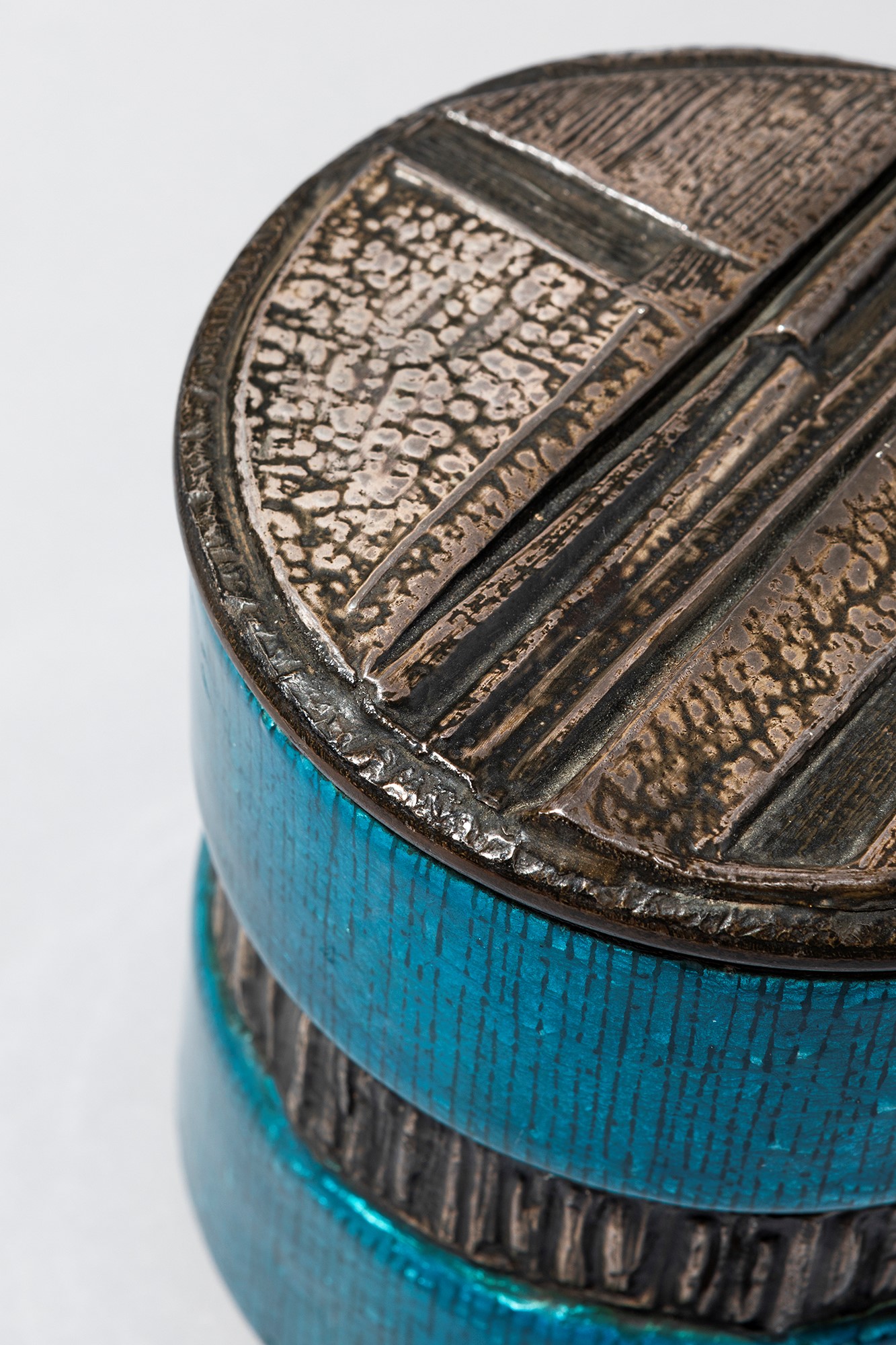 Smalto turchese su rame modellato a rilievo e lamina d’argento incisa.