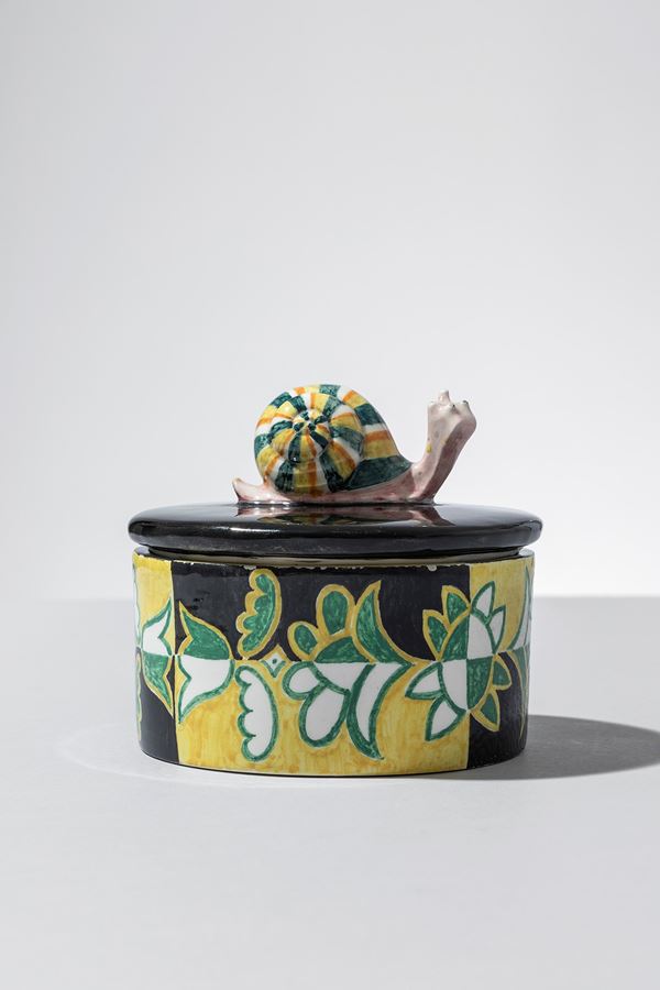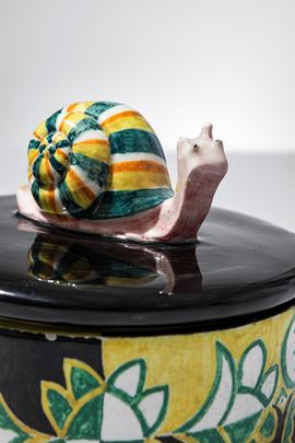 Terraglia modellata a colaggio, decorata in policromia sotto vernice.