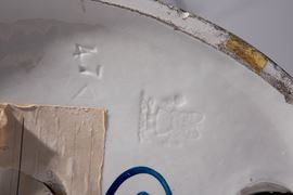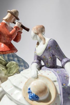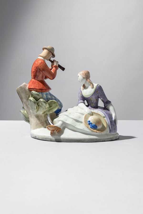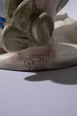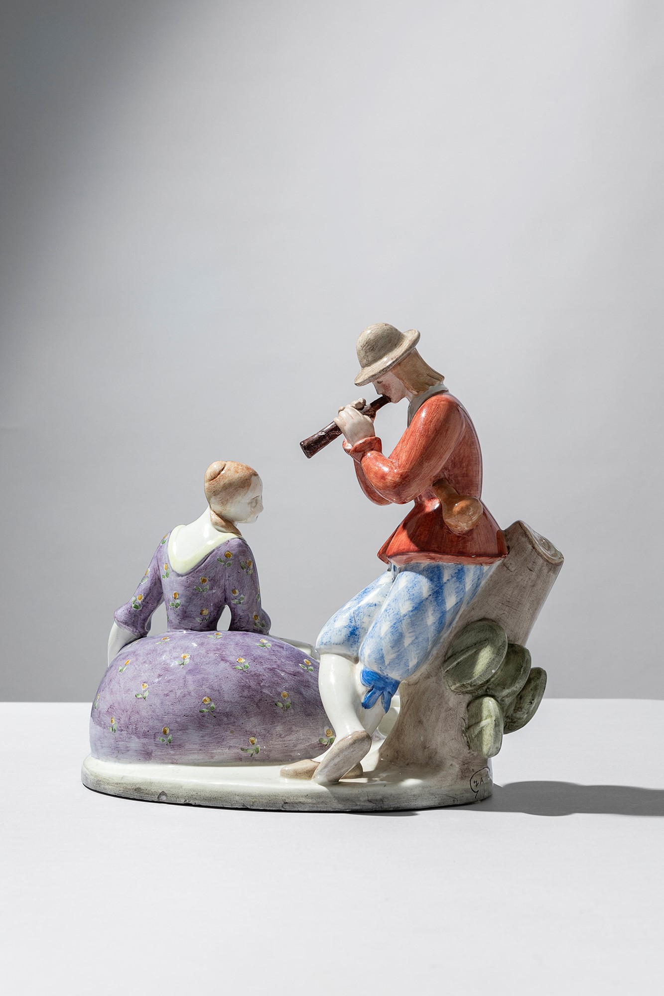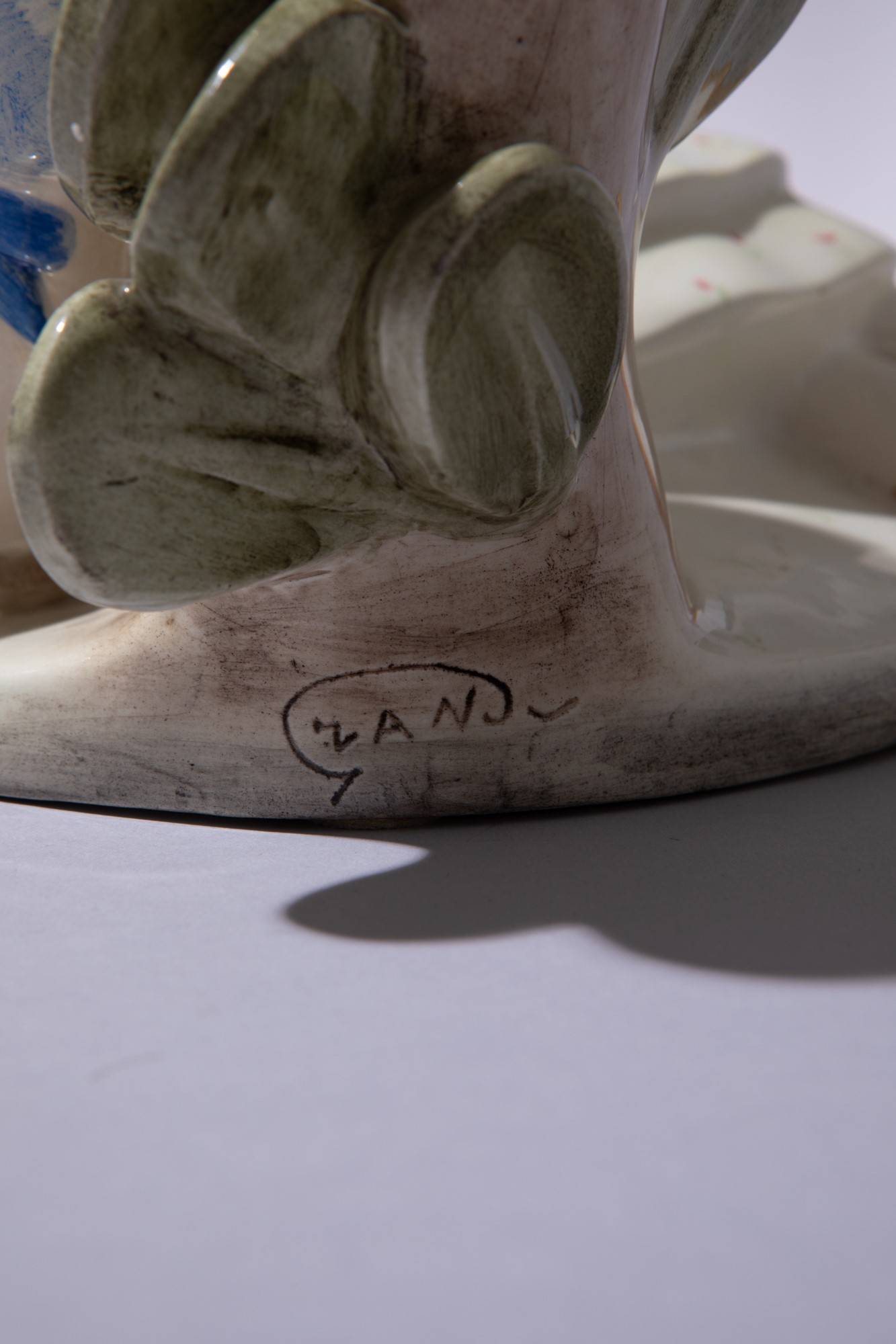 Terraglia modellata a colaggio, decorata in policromia sotto vernice.
