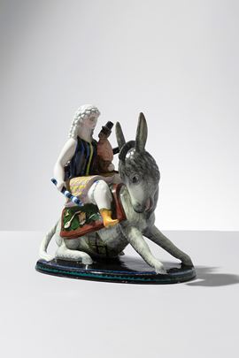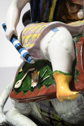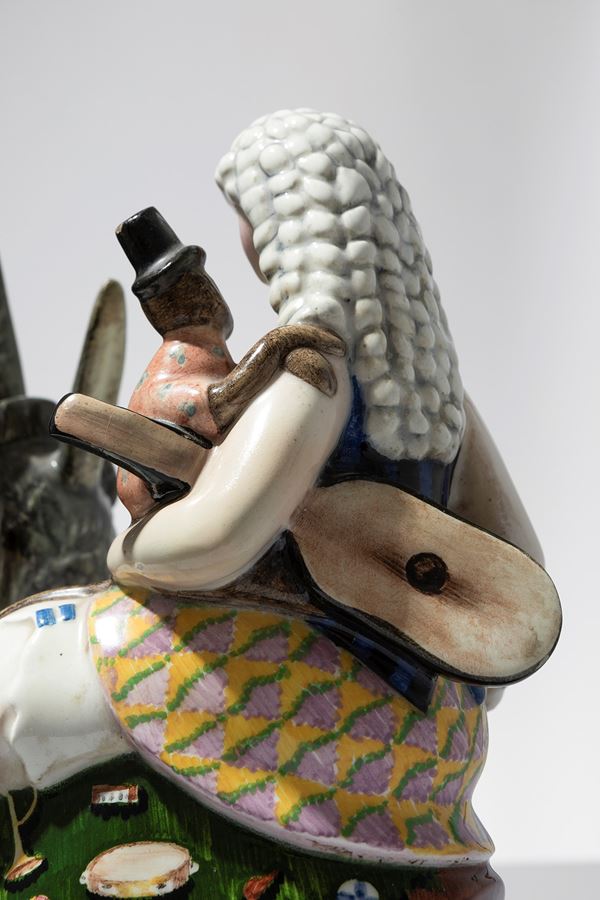 Terraglia modellata a colaggio, decorata in policromia sotto vernice.