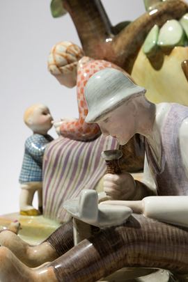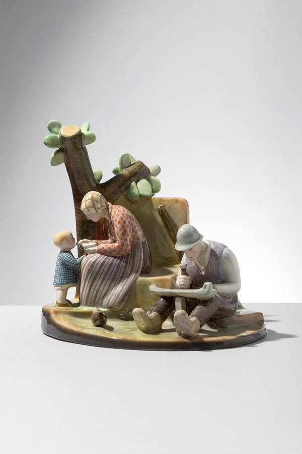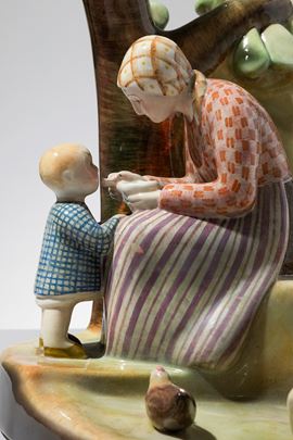 Terraglia modellata a colaggio, decorata in policromia sotto vernice.
