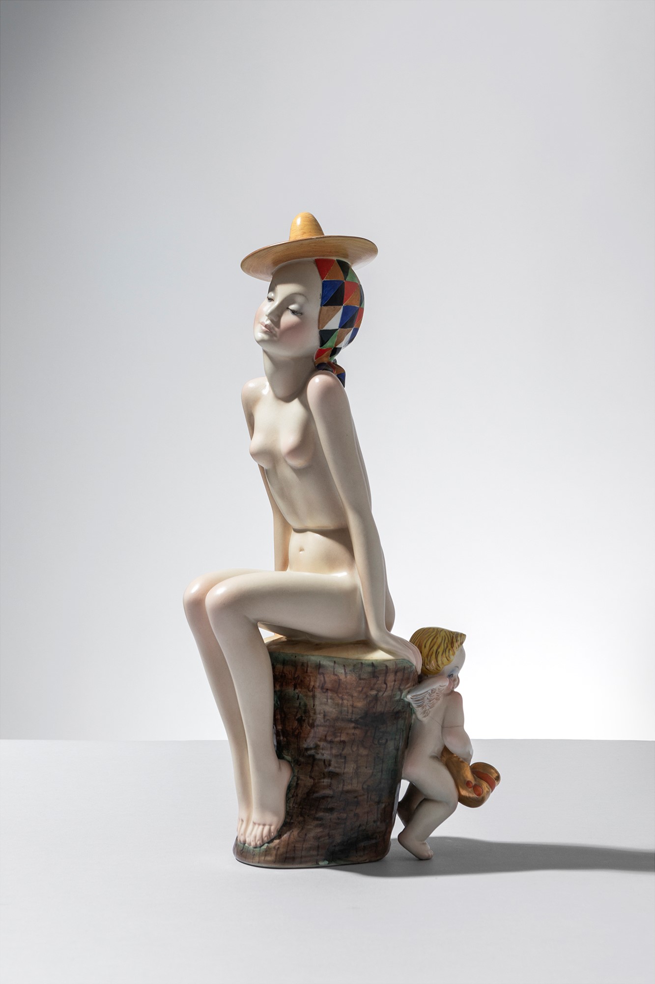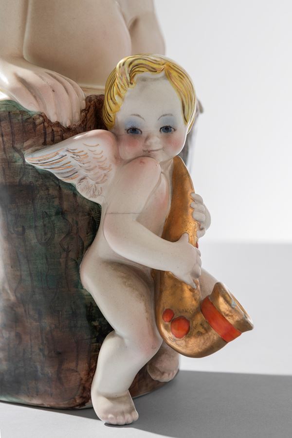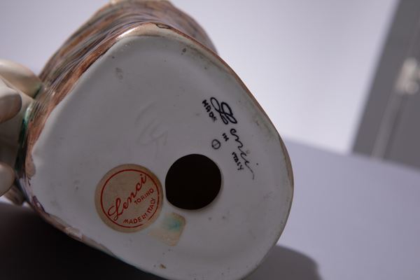 Terraglia modellata a colaggio, decorata in policromia.