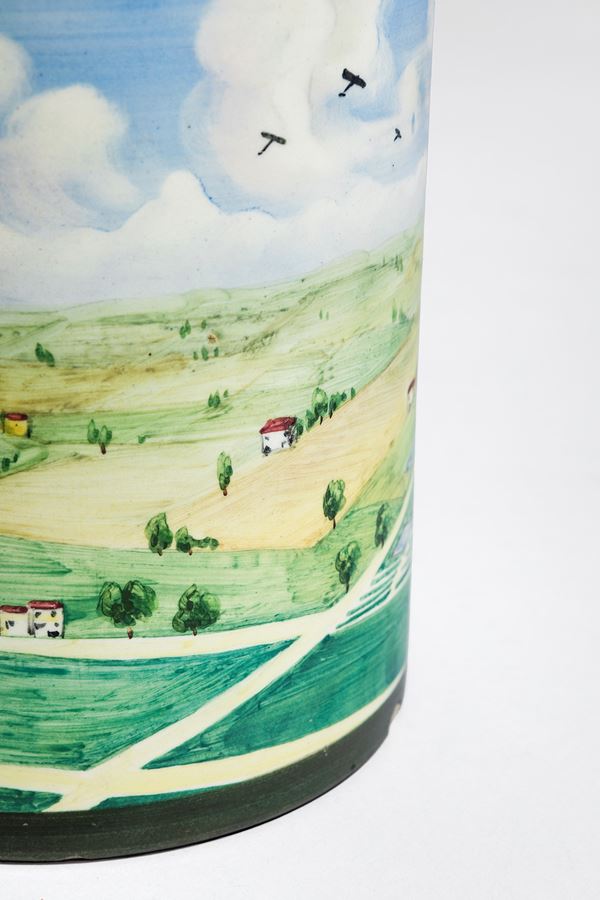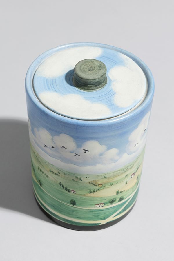 Terraglia modellata a colaggio, decorata in policromia sotto vernice.