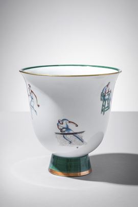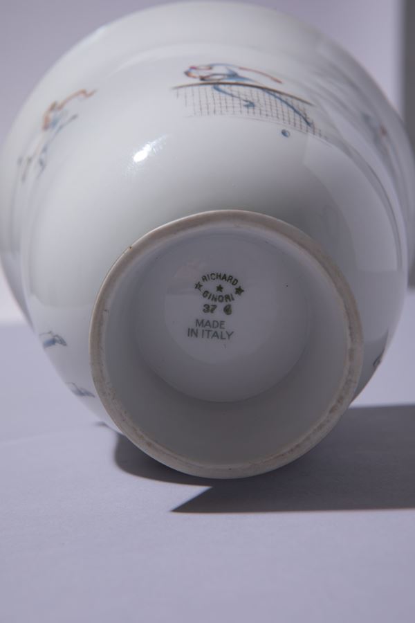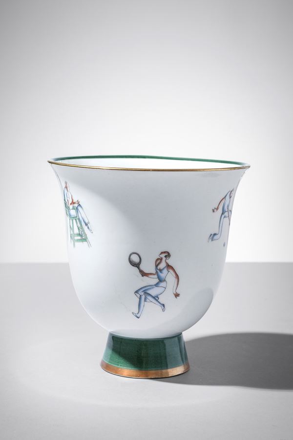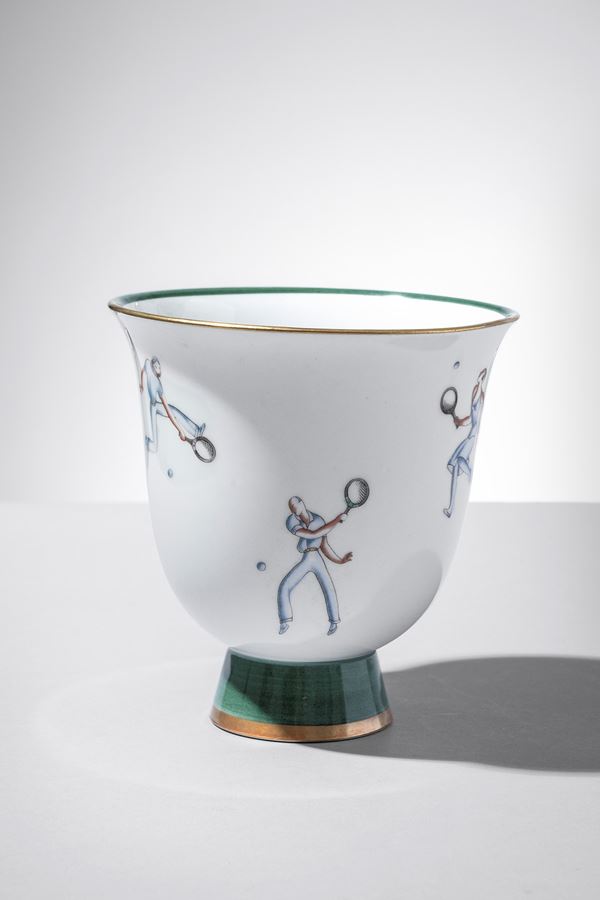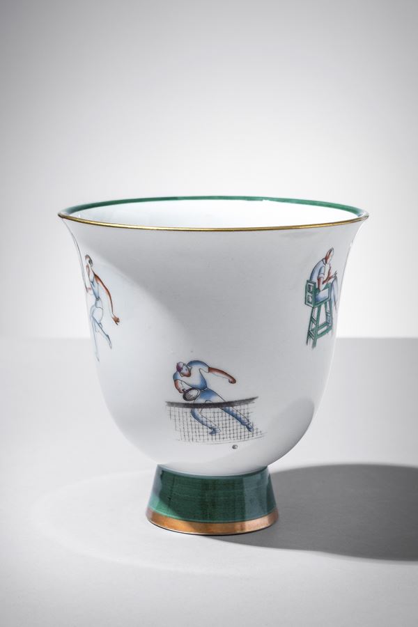 Porcellana bianca decorata in policromia con tennisti e doratura in terza cottura.