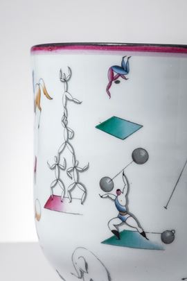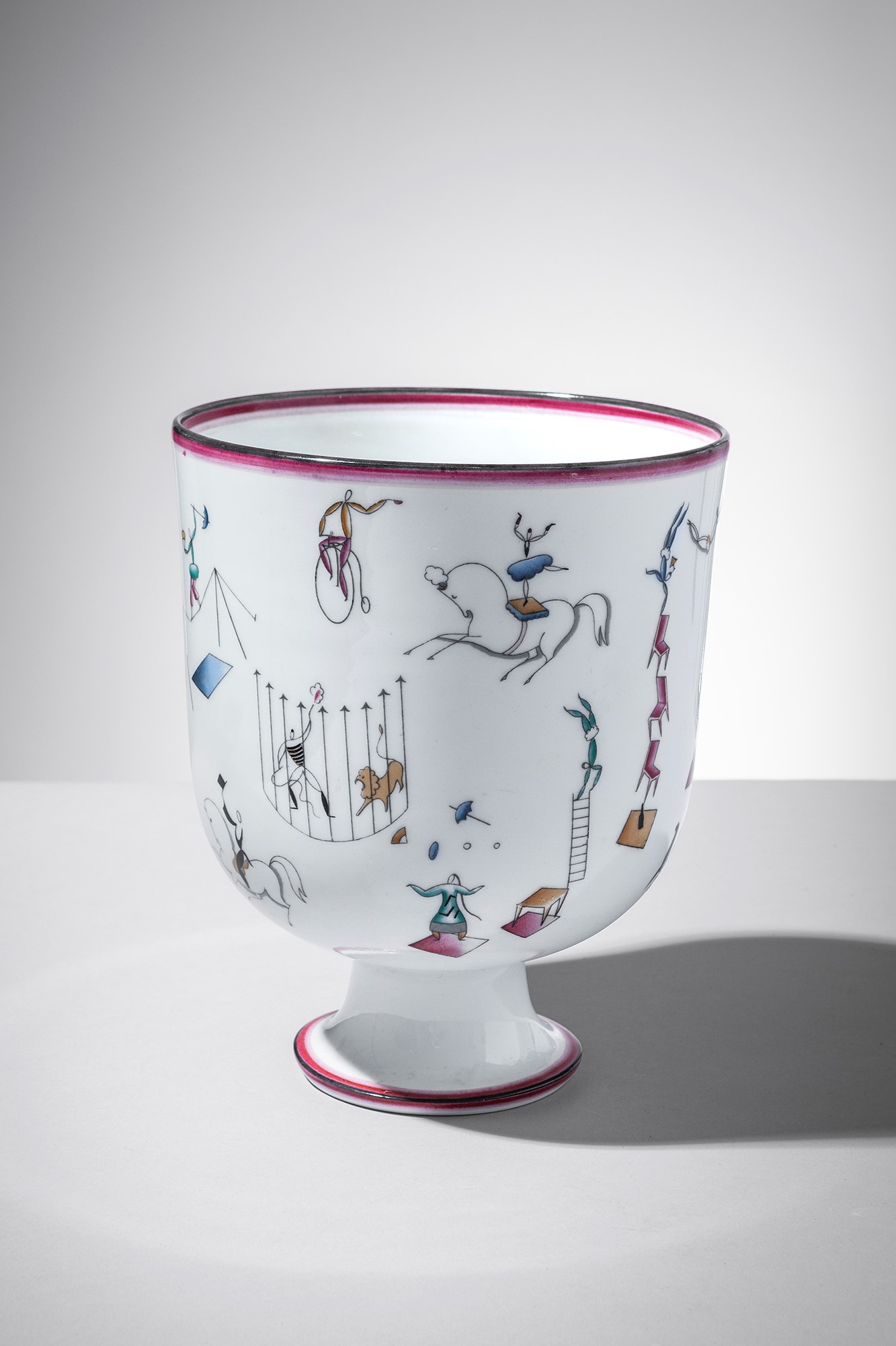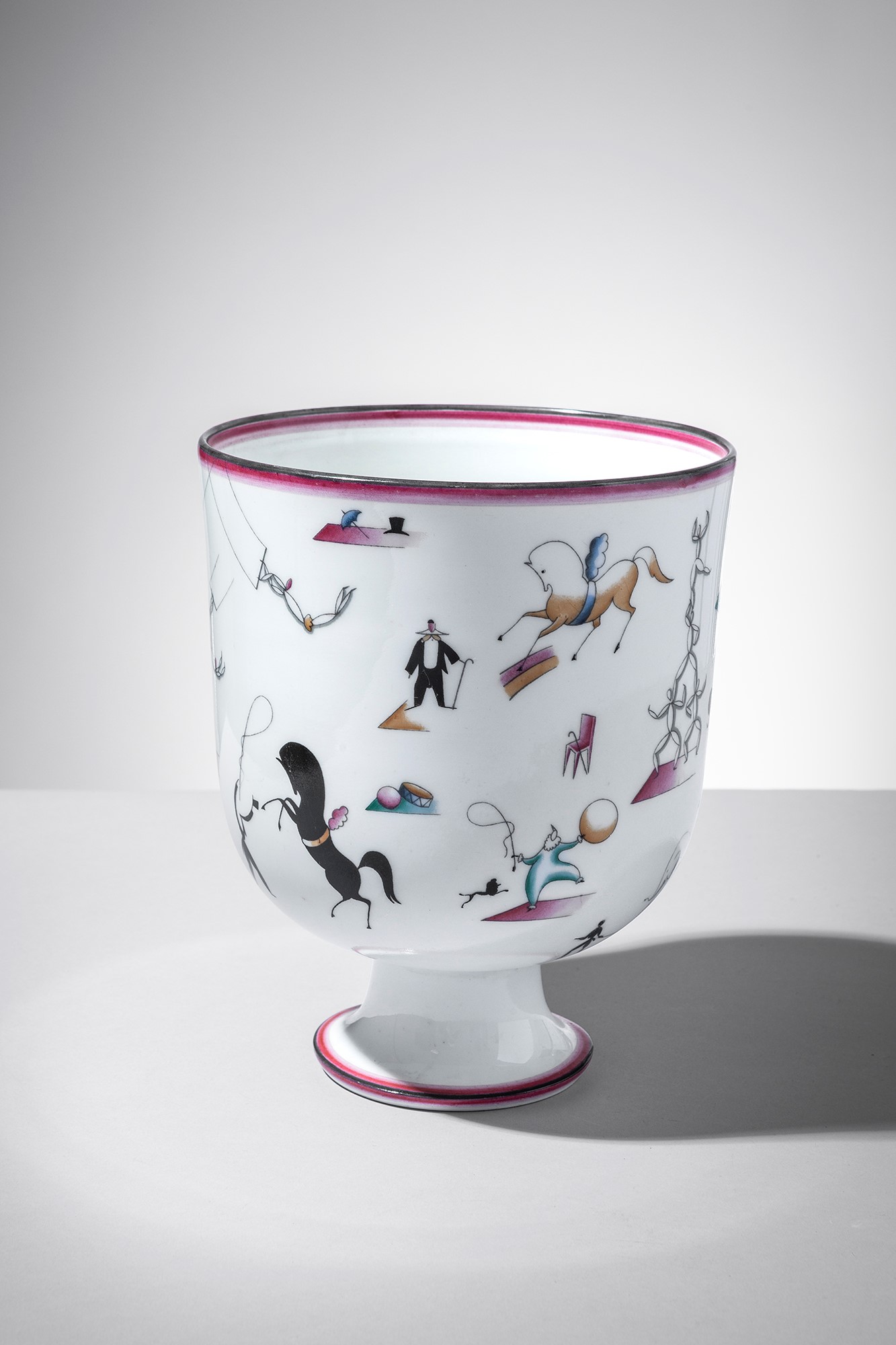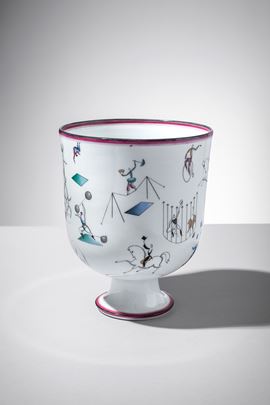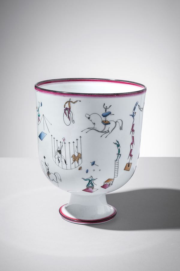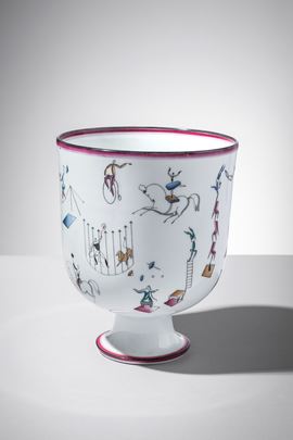 Porcellana bianca decorata in policromia con scene circensi.