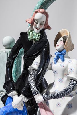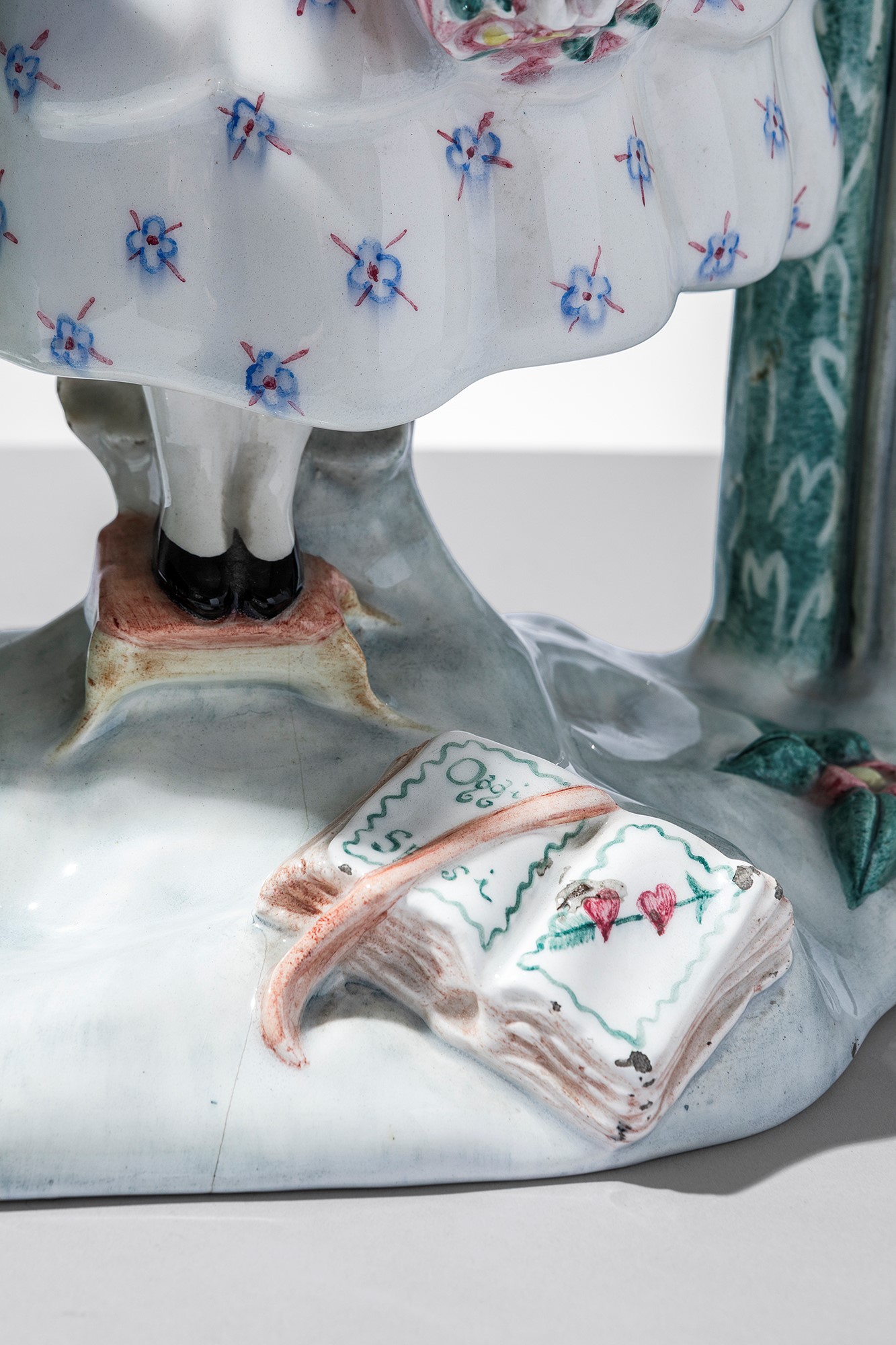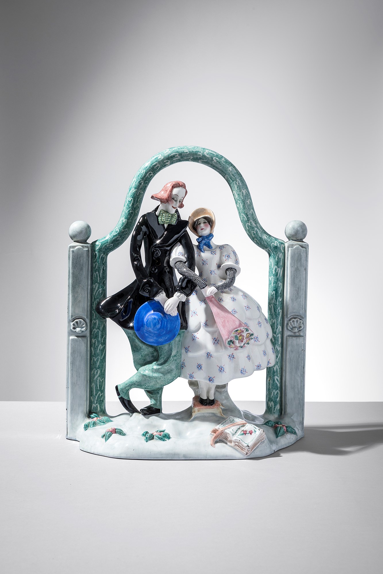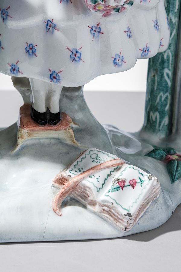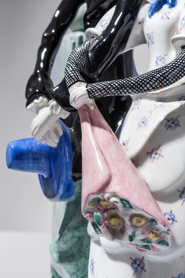 Terraglia modellata a colaggio, decorata in policromia sotto vernice.