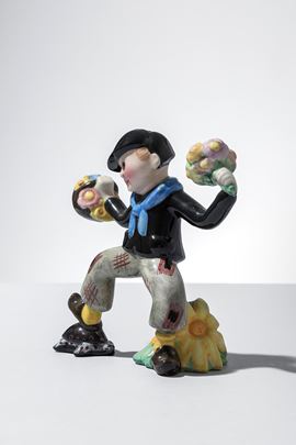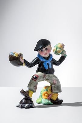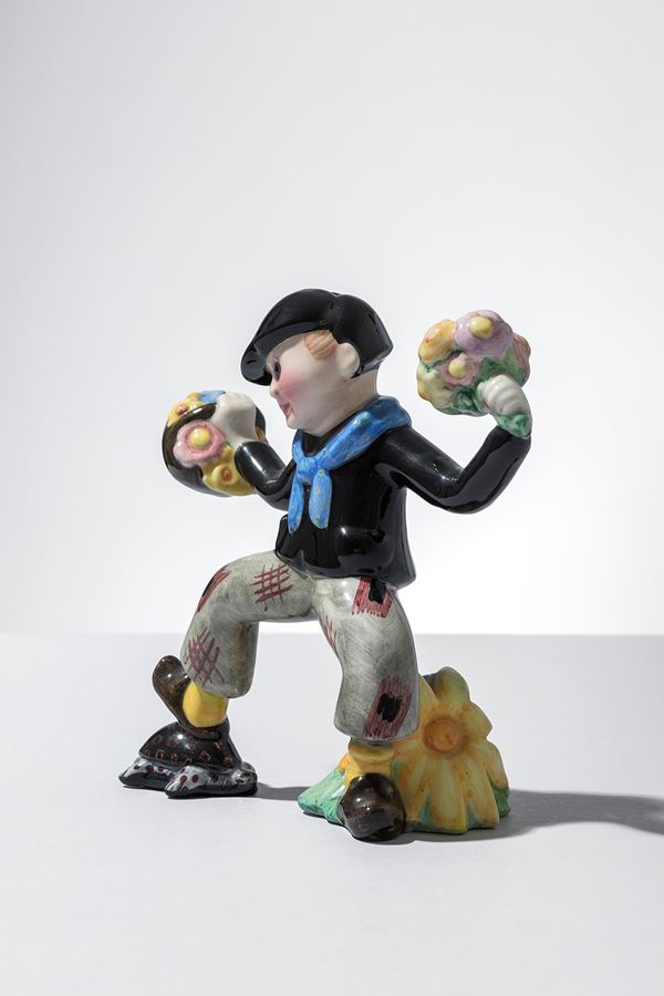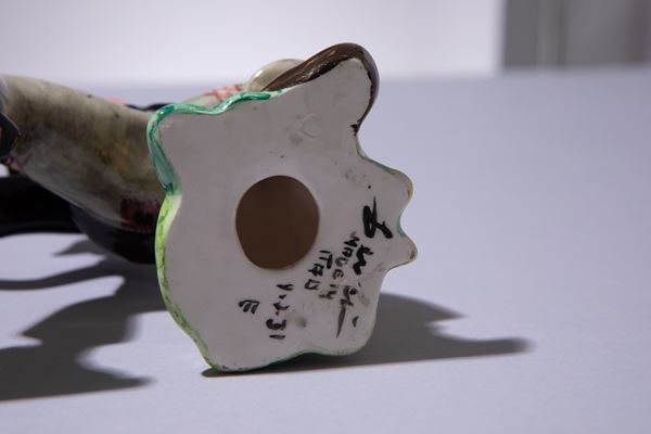 Terraglia modellata a colaggio, decorata in policromia sotto vernice.