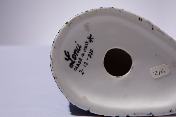 Terraglia modellata a colaggio, decorata in policromia sotto vernice.