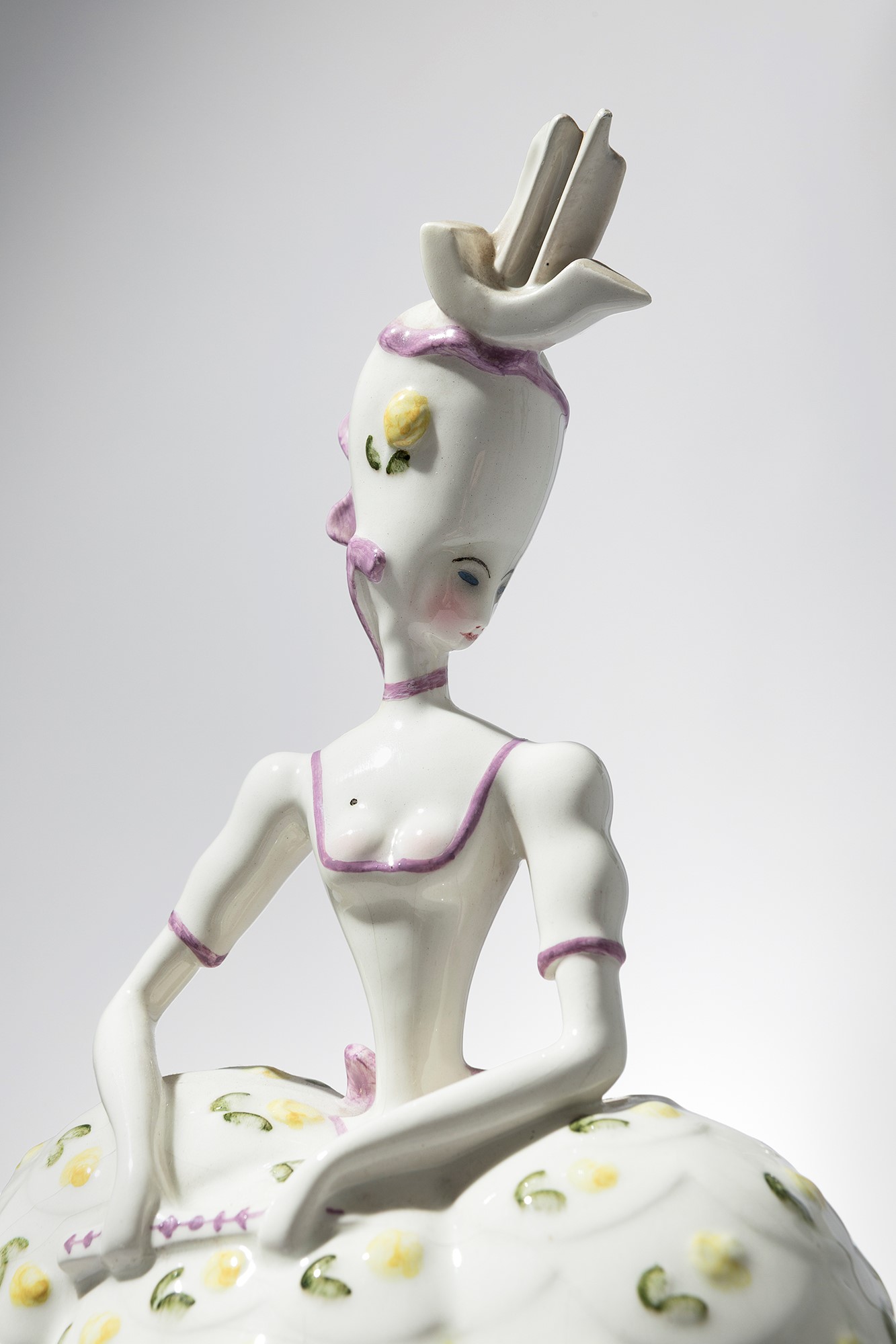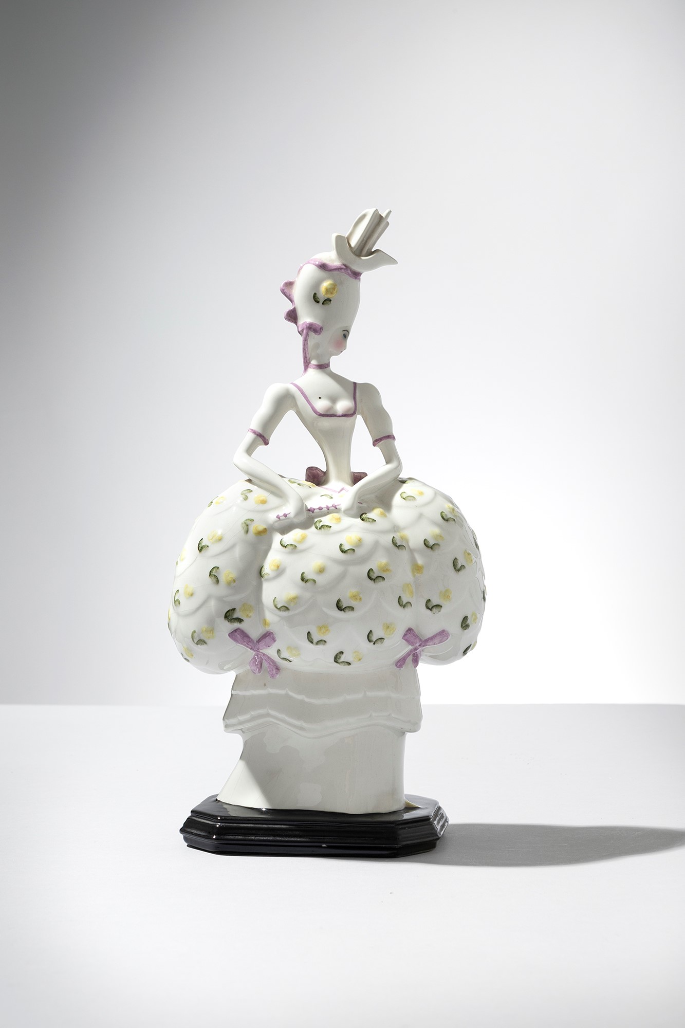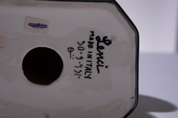 Terraglia modellata a colaggio, decorata in policromia sotto vernice.