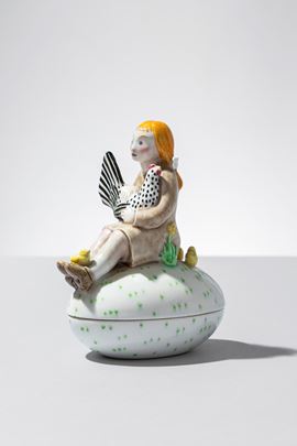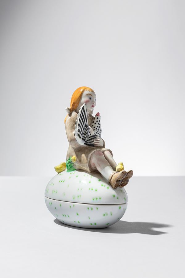 Terraglia modellata a colaggio, decorata in policromia sotto vernice.