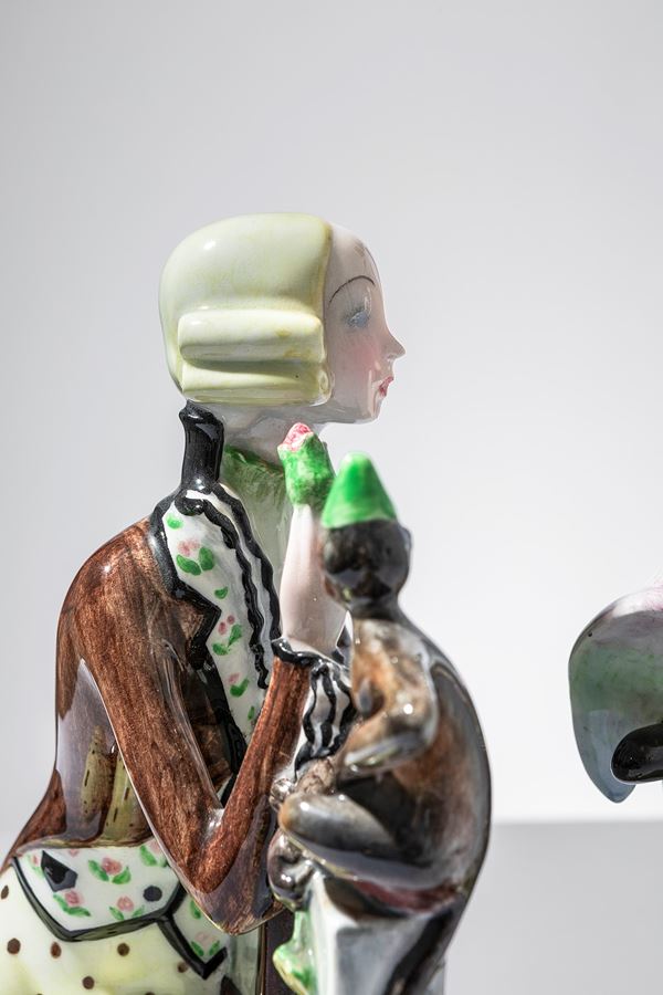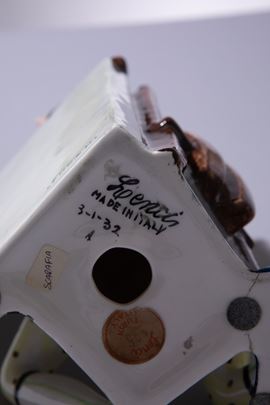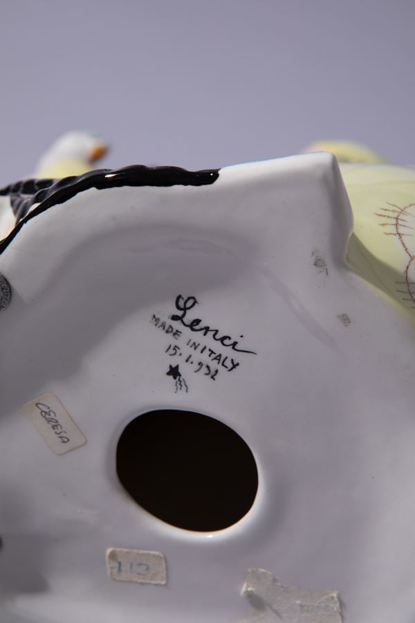 Terraglia modellata a colaggio, decorata in policromia sotto vernice.