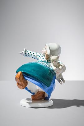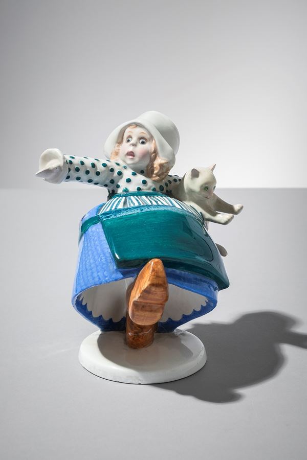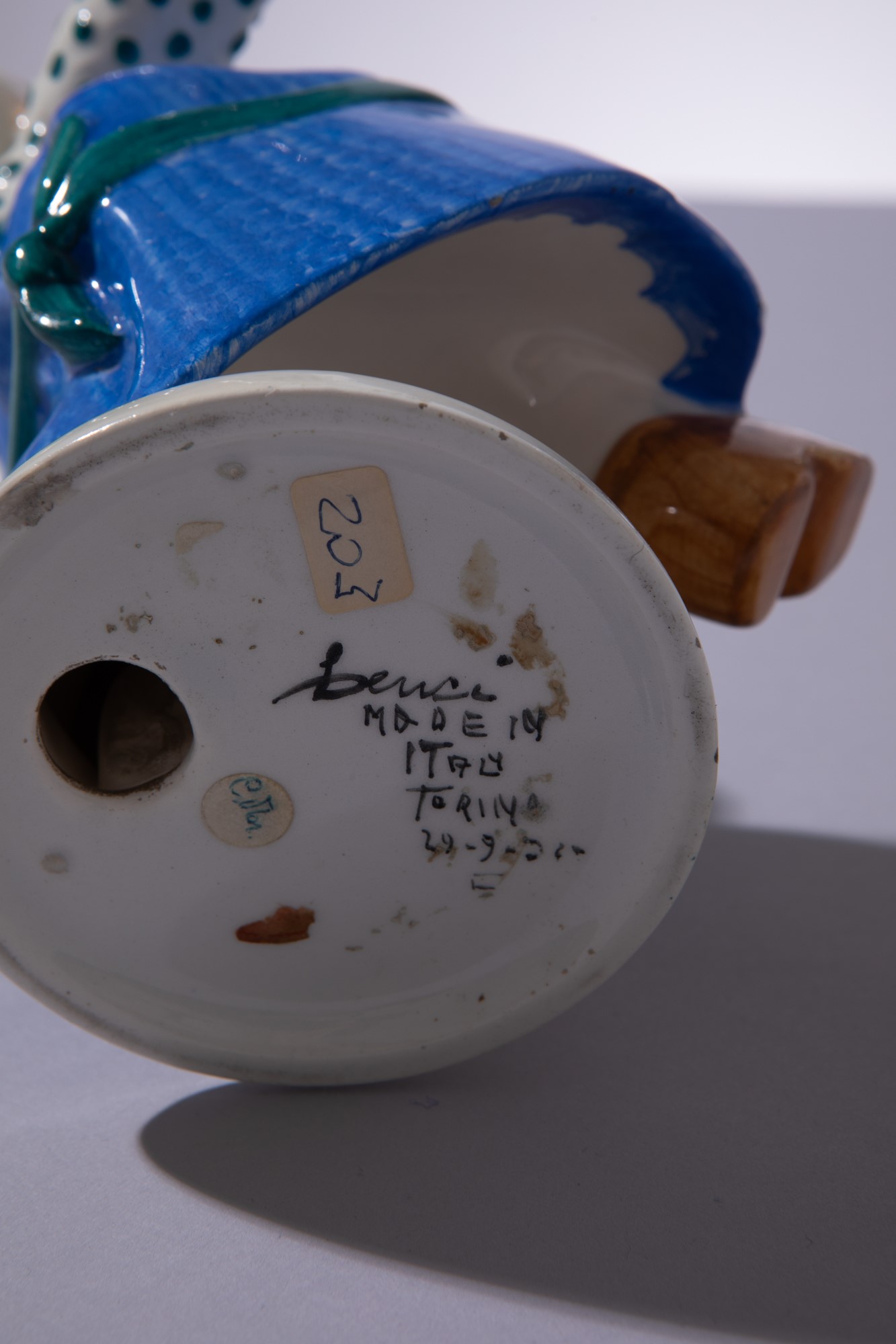 Terraglia modellata a colaggio, decorata in policromia sotto vernice.