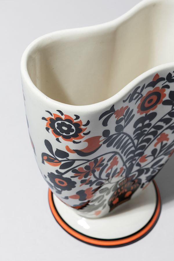 Terraglia modellata a colaggio, decorata in policromia sotto vernice.