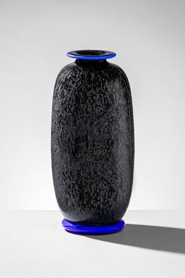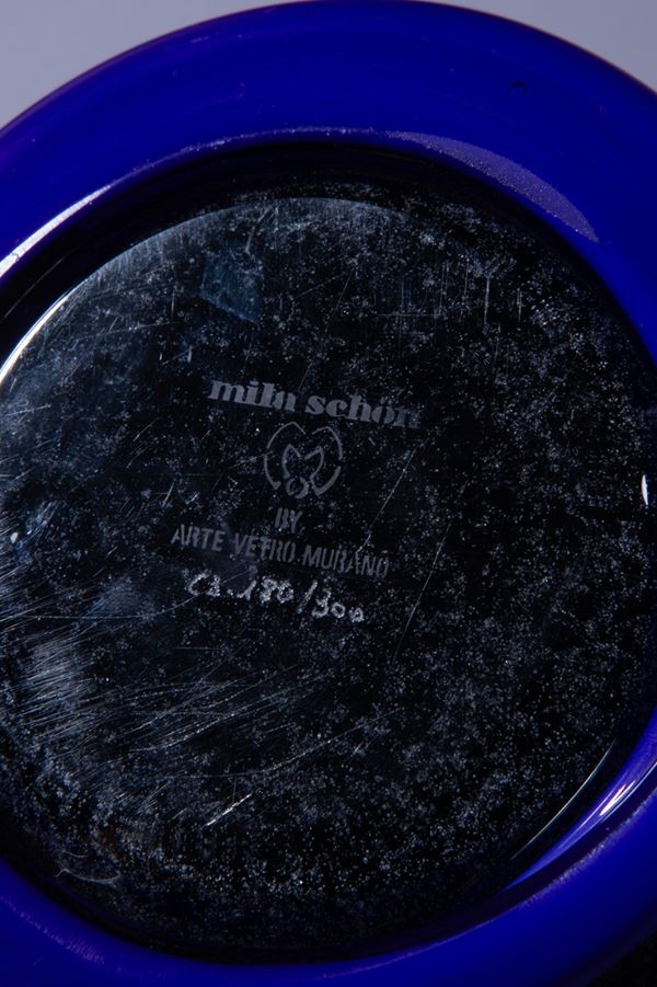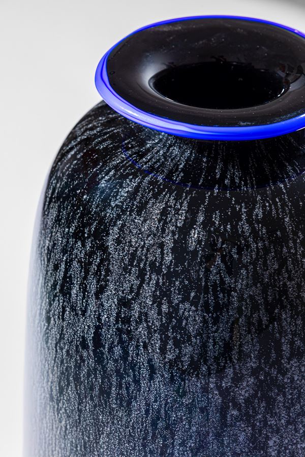 Vetro soffiato nero con con base e collo in vetro blu applicati a caldo.