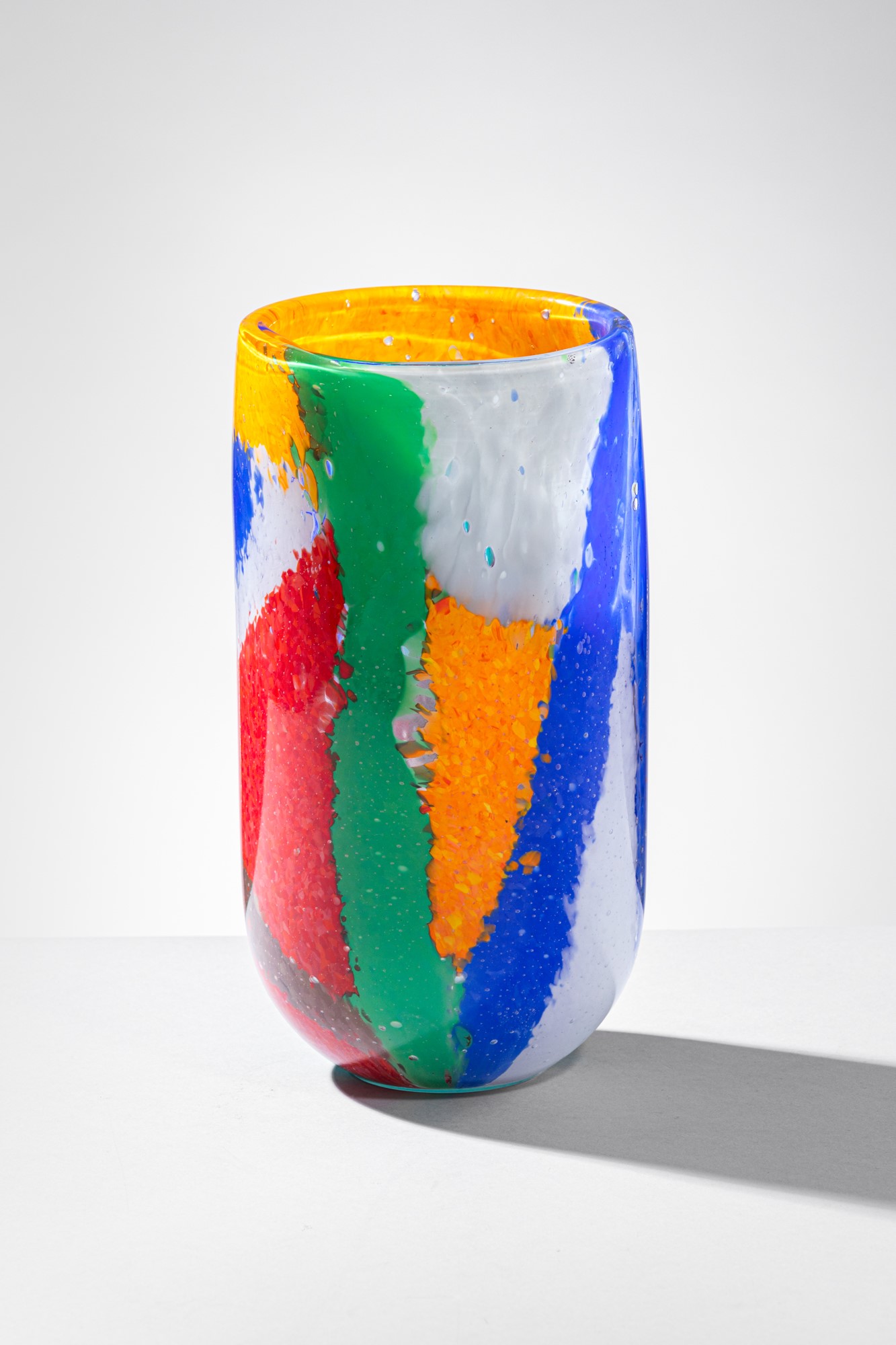 Vetro soffiato con schegge di vetro policrome applicate a caldo.