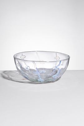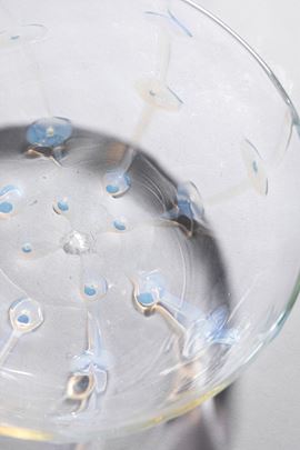 Vetro soffiato cristallo decorato a filamenti opalescenti che si allargano formando dei bolli in rilievo.