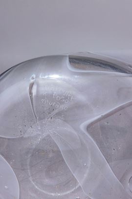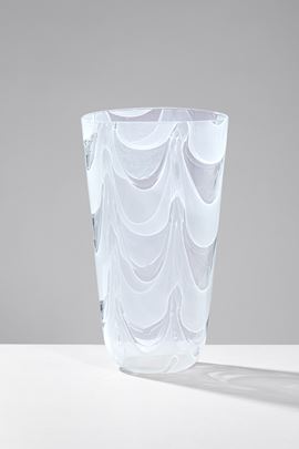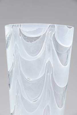 Vetro soffiato incolore con spirale bianco lattimo pettinata a festoni.