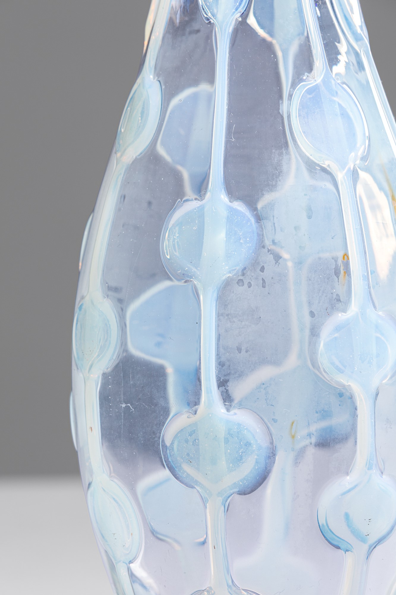 Vetro soffiato cristallo decorato a filamenti opalescenti che si allargano formando dei bolli in rilievo.