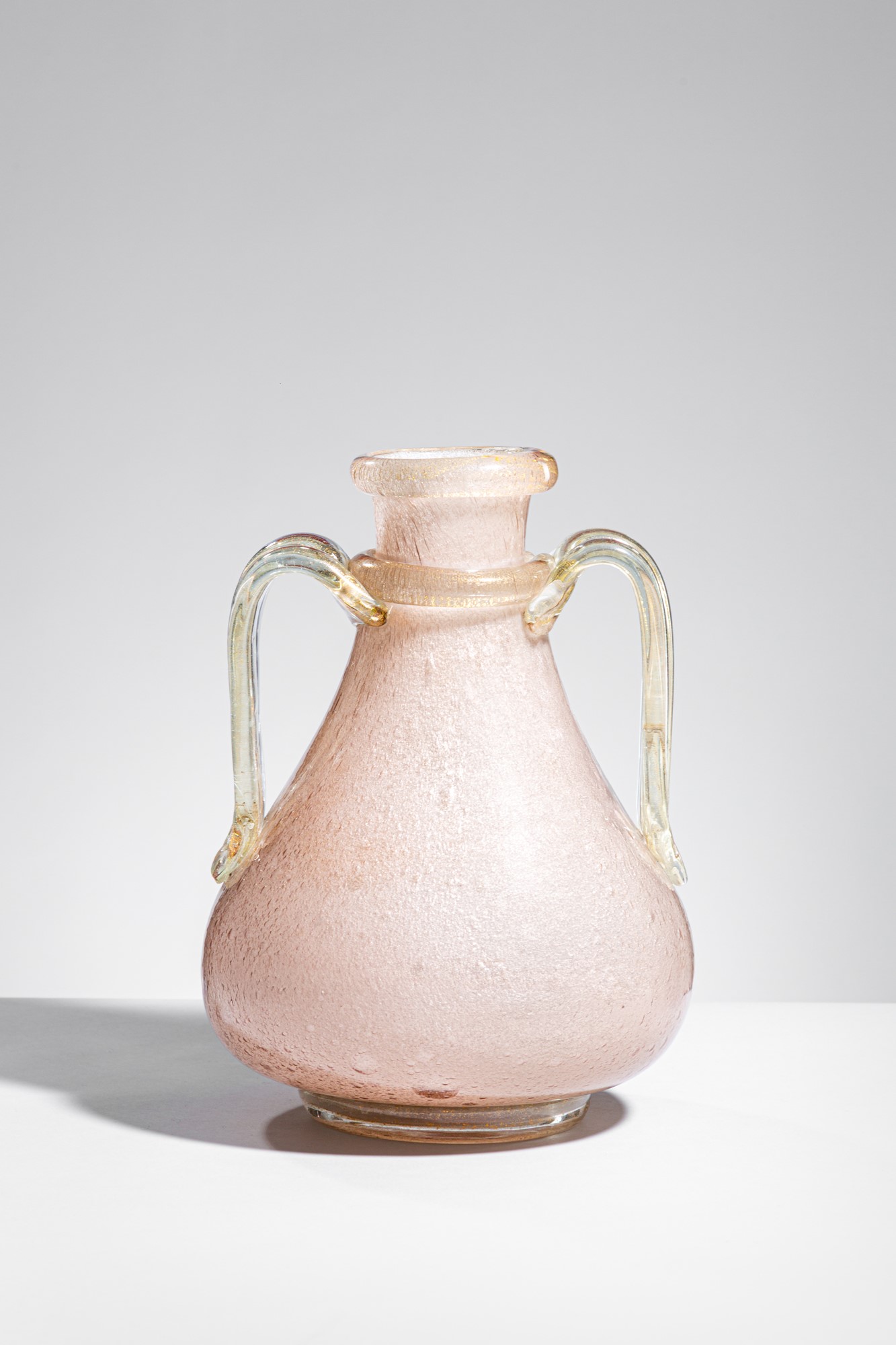 Vetro soffiato a bollicine con due grandi anse laterali.
