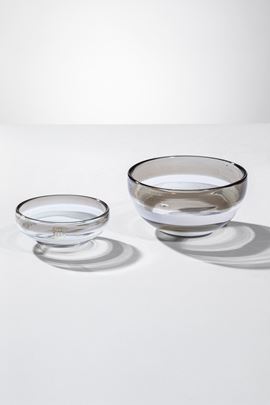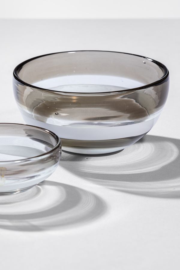 Vetro soffiato cristallo con fasce orizzontali lattimo e grigio.