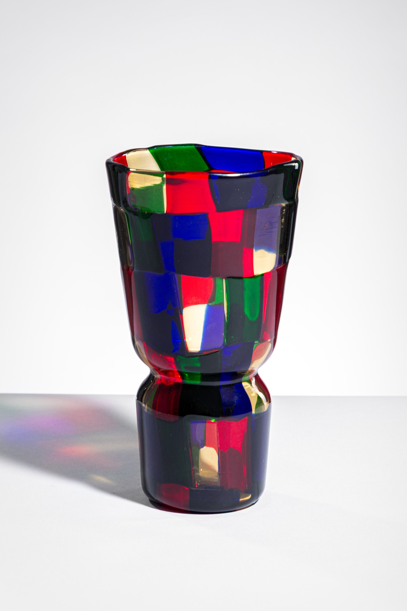 Vetro soffiato con tessere trasparenti nei colori pagliesco, rosso, verde e zaffiro.